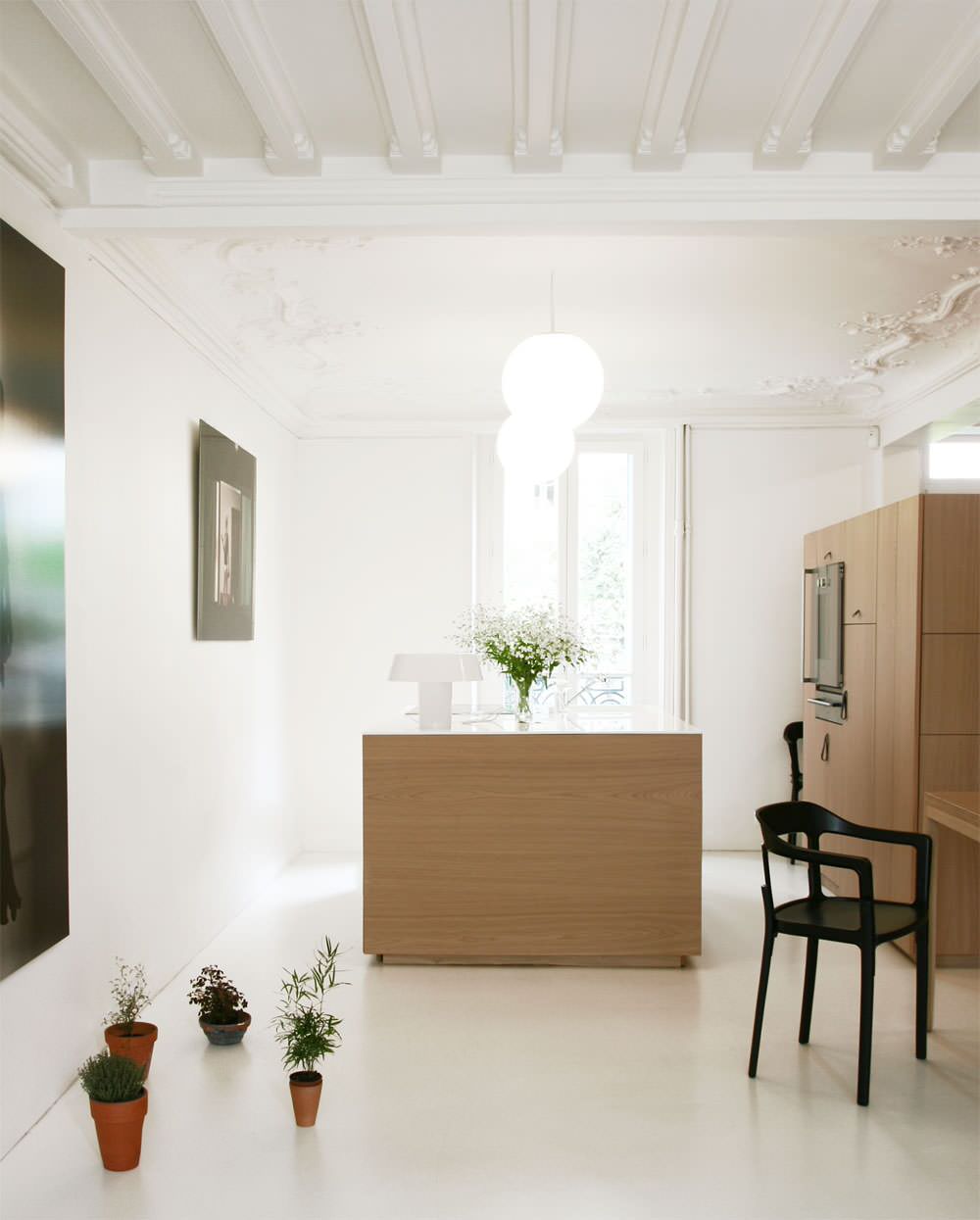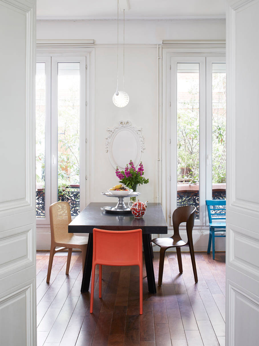 Dans cette petite salle à manger, notre regard ne se dirige pas vers le mur blanc et nous n’avons pas le sentiment que la pièce est triste. Cet effet est causé par le mobilier qui a été choisi avec soin. L’essence de bois, les piétements colorés, la structure même du mobilier réchauffent l’atmosphère et donne au blanc une certaine splendeur.