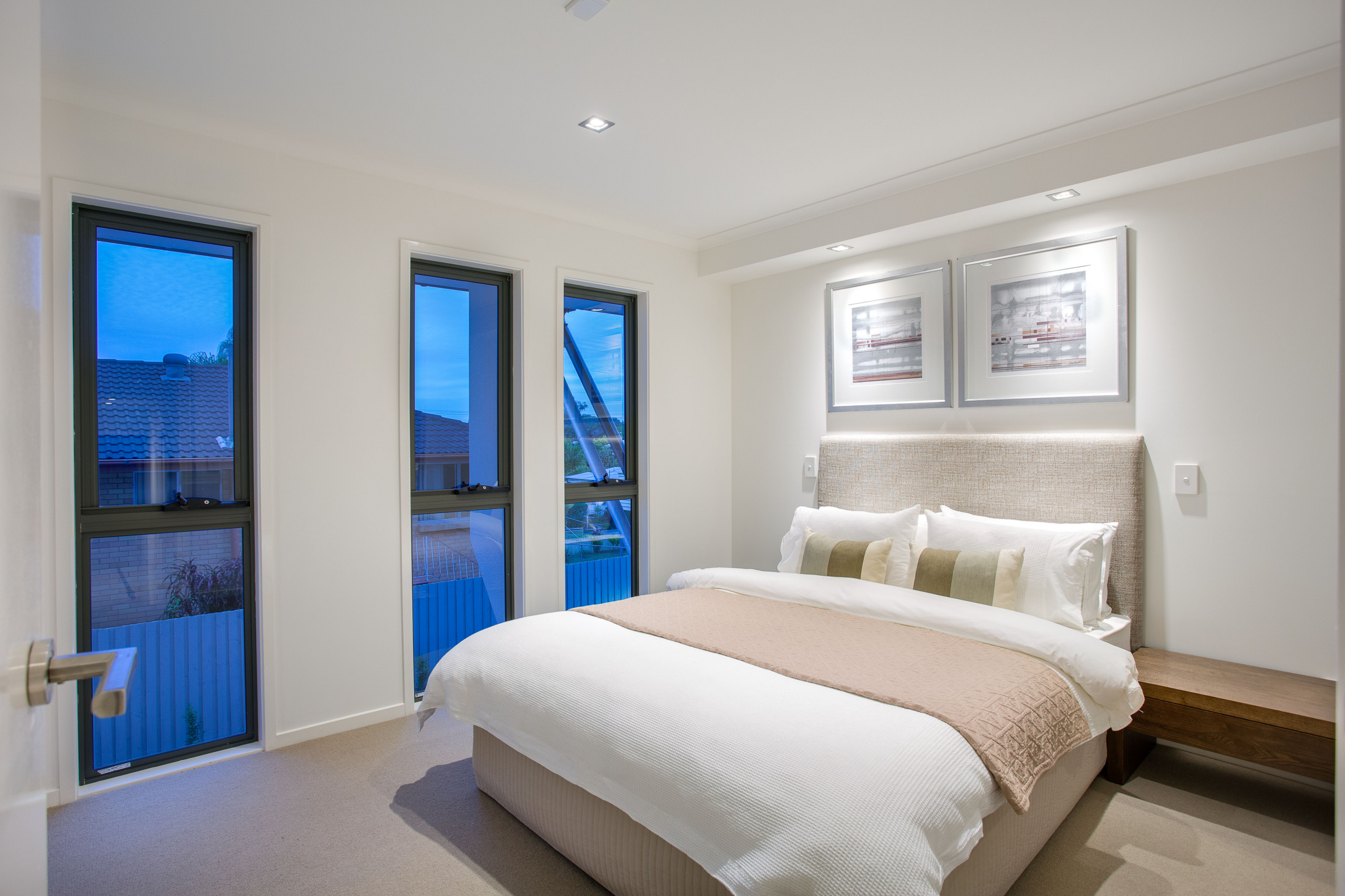 Dans cette chambre, le mur blanc sur lequel se repose le lit est mis en lumière au sens propre du terme. Un décroché au plafond permet d’avoir des spots au-dessus de la tête de lit et apporte un côté vivifiant au blanc.
