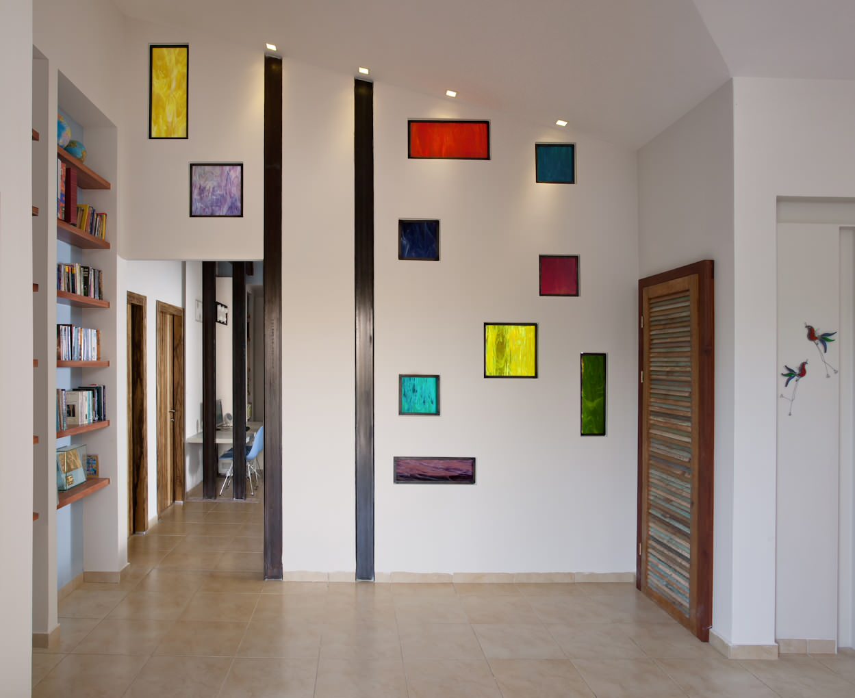 Lumière, couleur et transparence sont les mots-clefs de ce mur blanc résolument déco. Cet espace de passage a du caractère. Il est aussi lumineux alors qu’il y a peu de lumière naturelle directe qui s’y diffuse.