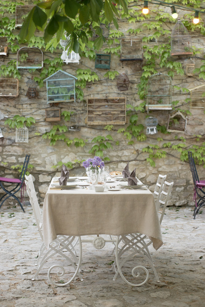 Comme pour tous les sujets que vous photographiez, l’importance de l’arrière-plan est cruciale. Si votre table est dressée devant un mur de végétation ou profite d’un cadre exceptionnel, pensez à l’exploiter. Ici, tandis que la table est présentée dans son ensemble, quelques feuilles et des ampoules allumées au premier plan semblent la contourner pour laisser apparaître le mur de cages accrochées dans la vigne vierge.