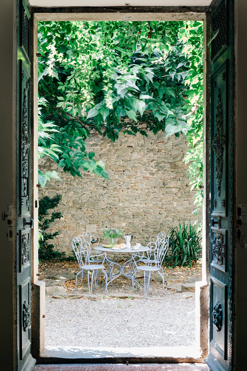 Inutile de se lancer dans des compositions ou des décors impressionnants pour donner envie de venir s’attabler. Une simple table romantique dressée pour un déjeuner dans le jardin, et déjà une douce sensation nous envahit. Penser au cadrage est la clé d’une photo réussie. Ici, le photographe n’hésite pas à pénétrer dans l’ombre du seuil de la maison pour profiter d’un cadre naturel offert par la belle porte à deux battants. Le tiers supérieur est entièrement occupé par les feuilles d’un vert qui laisse deviner que le jardin est arboré.