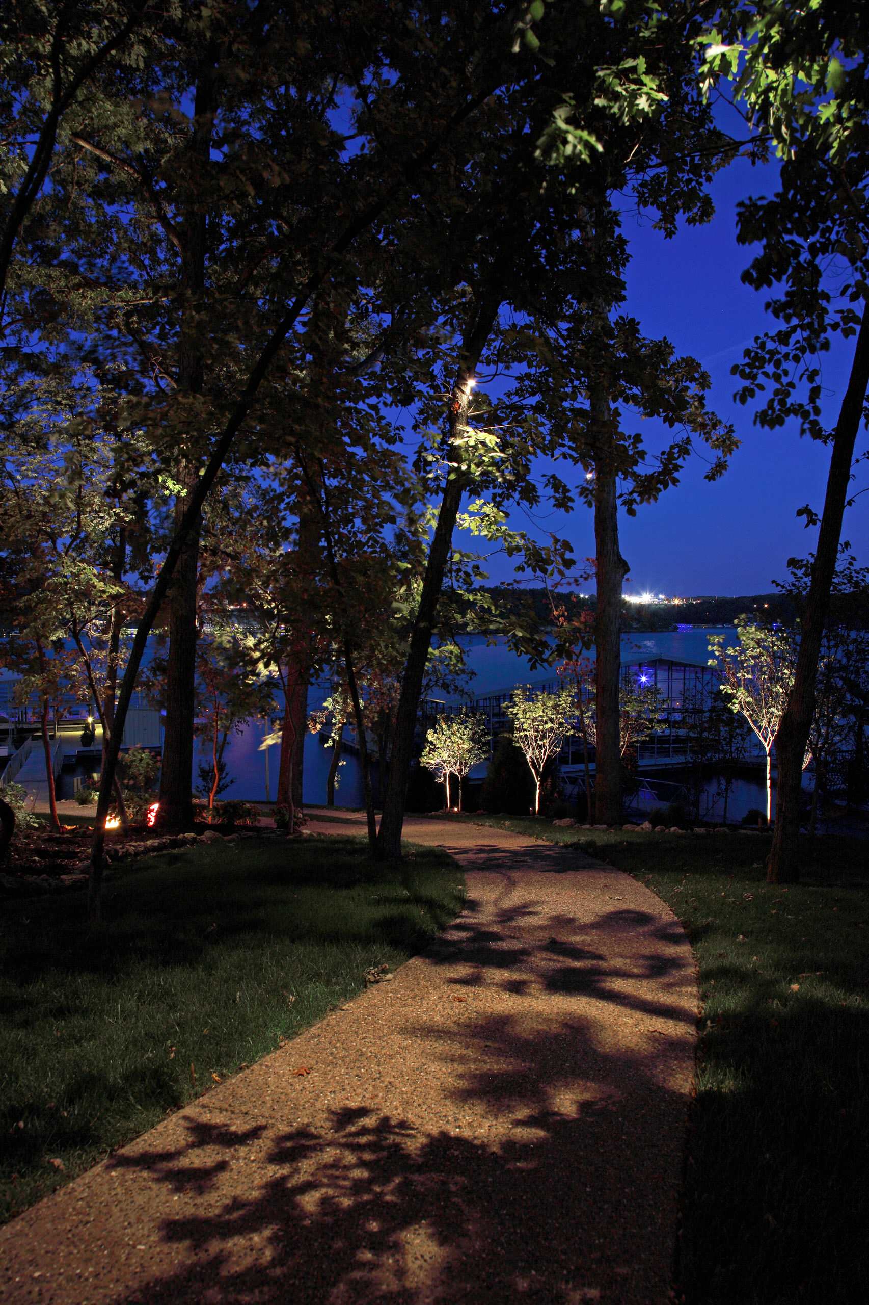 Les spots placés entre les branches des arbres donnent la sensation d’une lumière lunaire sur le chemin au premier plan. Les éclairages en contre-plongée, placés à la base des grands pins, ajoutent de la profondeur à ce paysage nocturne tout en procurant une luminosité suffisante pour répondre à des exigences de sûreté et de sécurité. La structure des branches et la couleur claire de l’écorce des arbres à feuilles caduques, que l’on voit au second plan, en font des cibles toutes désignées pour un éclairage d’extérieur (plutôt séduisant, non ?).