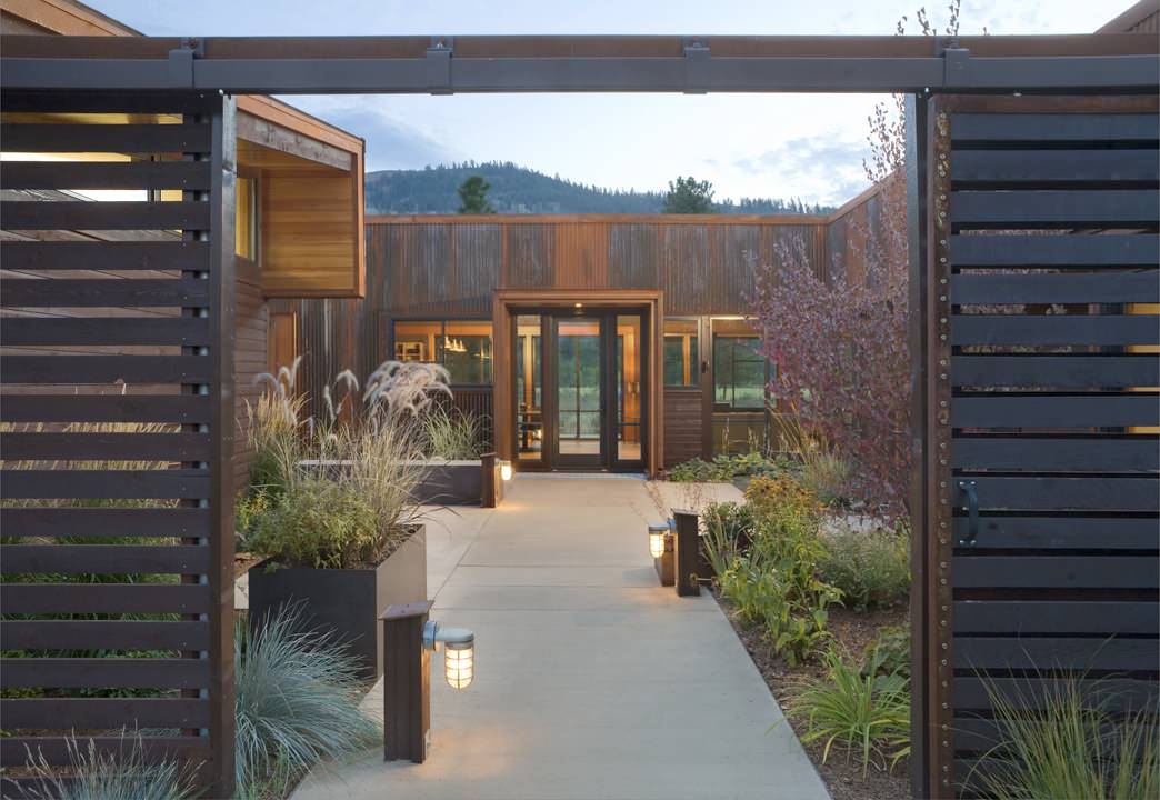Bien qu’elles soient installées directement sur le mur de la maison, ces appliques lumineuses contribuent à donner un effet net à l’éclairage extérieur. Elles sont idéalement placées pour qu’il soit facile de monter les marches et de se déplacer sur la terrasse pour atteindre la porte d’entrée. Elles sont presque trop lumineuses pour un paysage aussi rural et il serait peut-être avisé de les équiper d’un variateur (au niveau de l’interrupteur) pour créer une luminosité d’ambiance modulable à loisir.