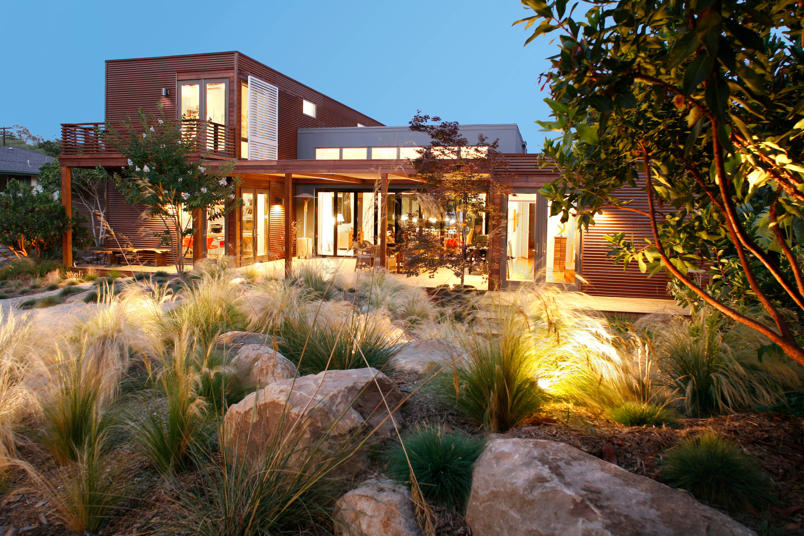 Dans ce jardin, on a utilisé des sources lumineuses venant à la fois de l’intérieur et de l’extérieur de la maison.