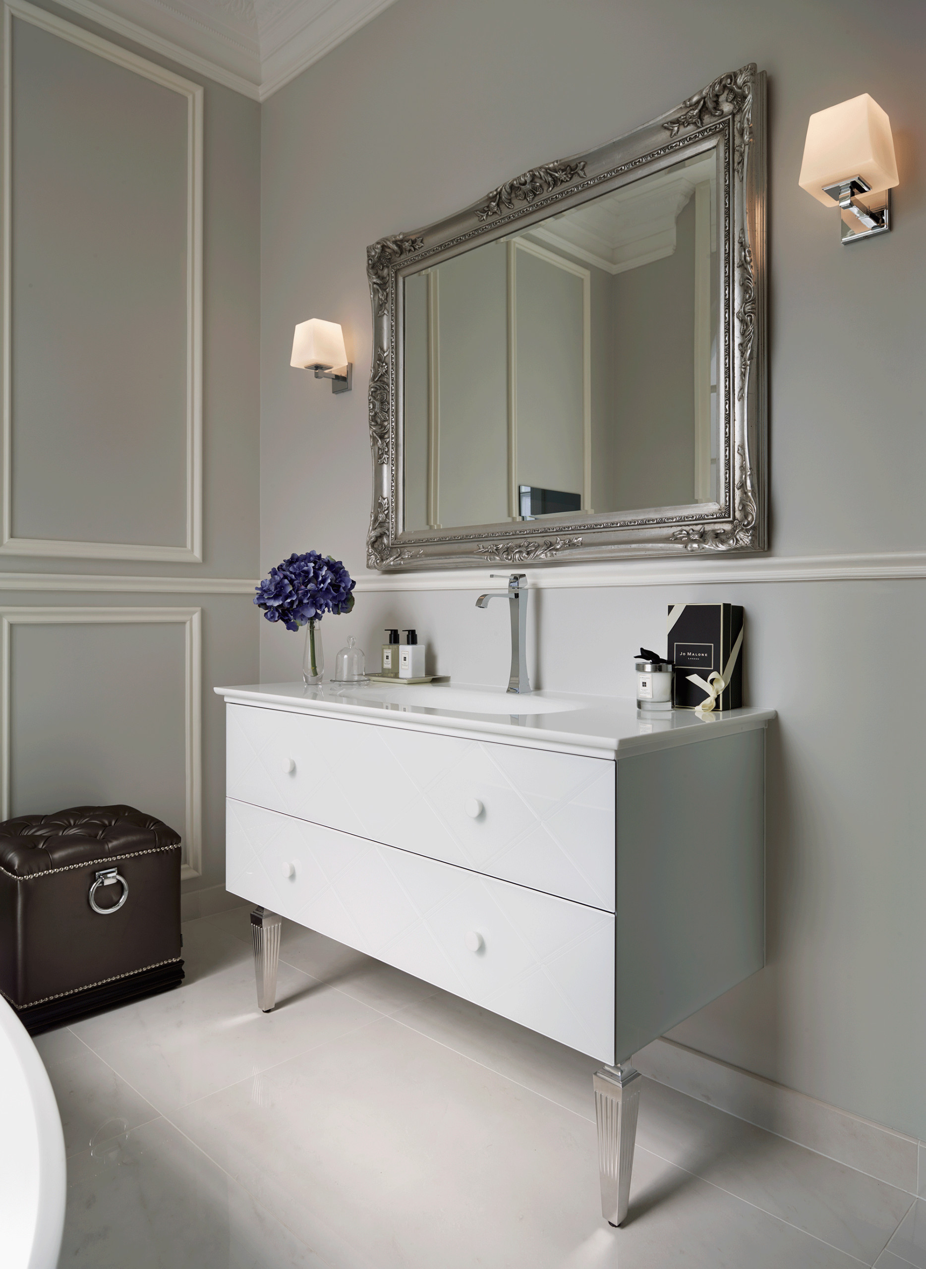 Partez à la recherche d’accessoires originaux. Cette console, par exemple, fait un meuble sous lavabo qui ne passera pas inaperçu. Papier peint imprimé, miroirs travaillés et chandeliers peuvent également apporter une âme au lieu.