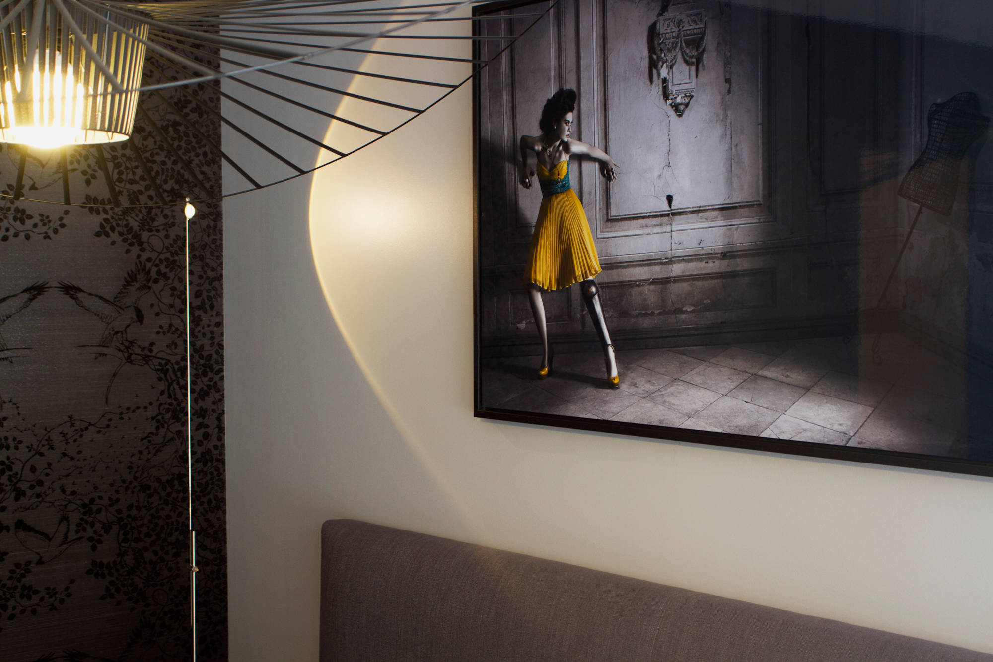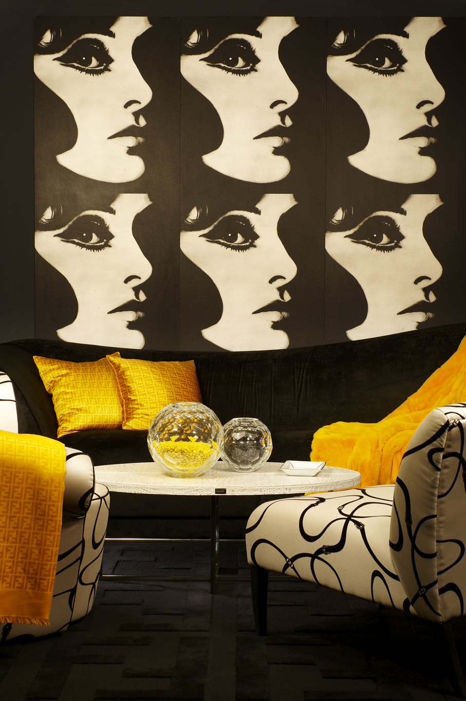 Le jaune moutarde y flamboie, comme l’or dévoilait la puissance des monarques il y a deux siècles. Le noir le souligne et le met en valeur au point parfois de s’effacer, à l’instar du divan qui disparaît sous les coussins. Quel faste !