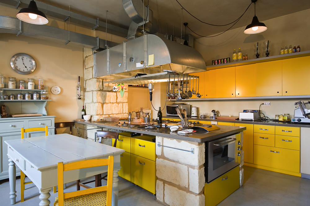 Le jaune moutarde lui permet de se démarquer du salon. Ici, on peut même en faire un peu plus qu’ailleurs en repeignant les meubles de rangement, mais aussi les chaises. Quant au réfrigérateur de style américain, il pourrait même prendre des allures de taxi new-yorkais !