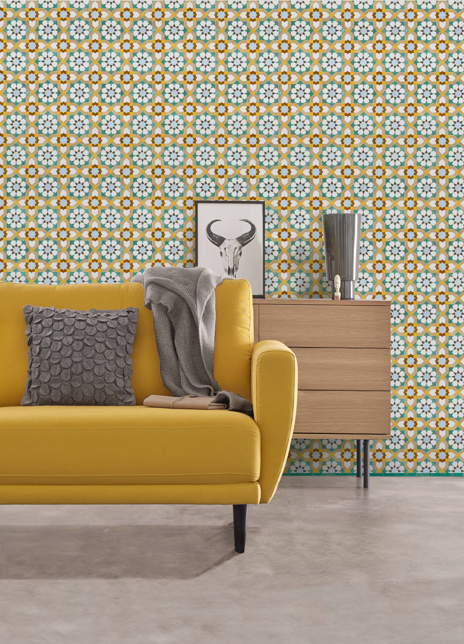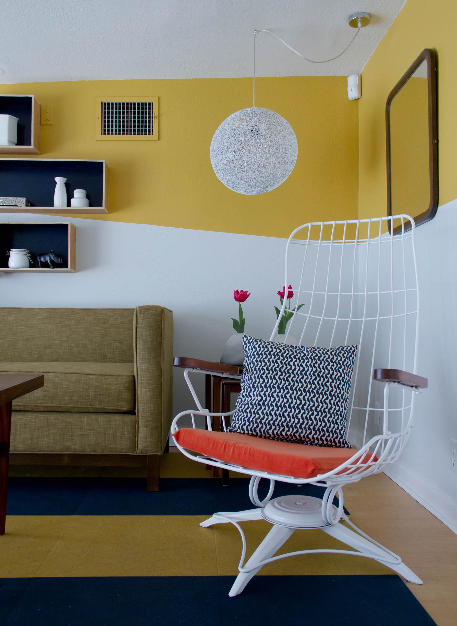 Le jaune moutarde des sixties est aussi l’ami de la géométrie. C’est pourquoi vous pouvez vous amuser à peindre votre (nouvelle) vague de jaune sur un mur blanc du salon. Et pourquoi pas, comme sur cette photo, suspendre une lampe toute ronde comme un soleil blanc aérien se détachant sur votre fond jaune !