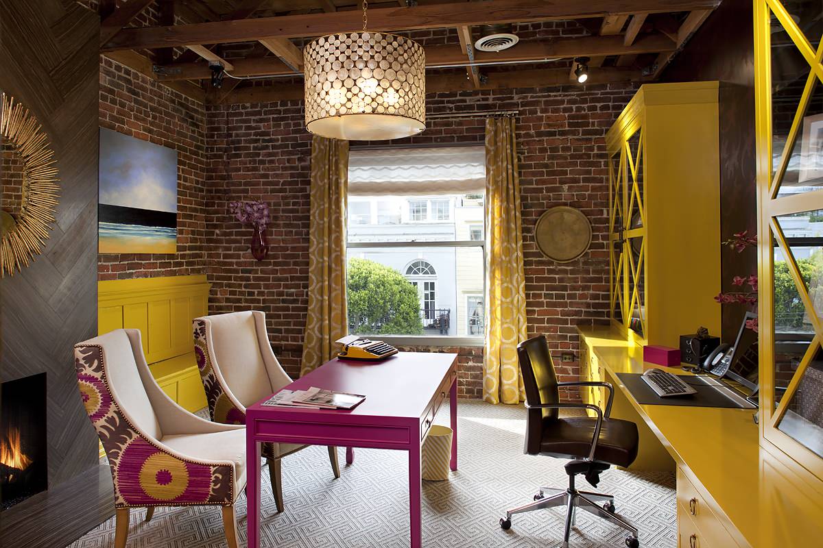 Voici un bureau incroyablement gai, rétro et pimenté ! Une ambiance éclectique où le jaune s’amuse aussi bien avec le rose fuchsia qu’avec la brique.
