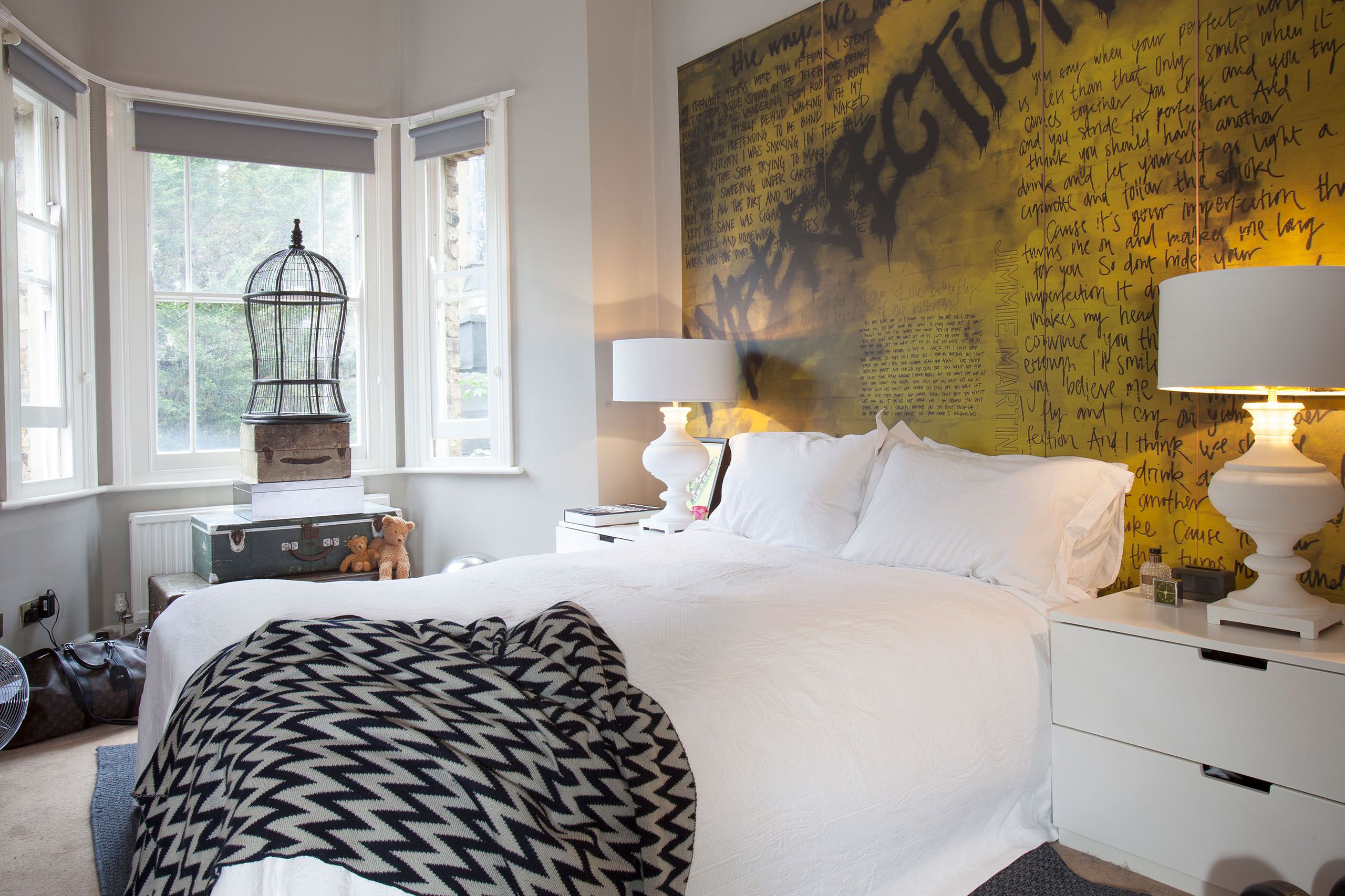 Sublimée par les matières et l’association de couleurs, cette chambre tout à fait actuelle se révèle à la fois cosy et lumineuse, veloutée et enflammée. C’est l’effet du jaune moutarde : il attise les bleus tandis que ceux-ci l’apaisent. Un tandem qui fonctionne aussi bien dans une chambre que dans un salon. Mais gardez-vous d’avoir la main lourde sur le jaune dans la chambre : saupoudrez juste ce qu’il faut pour doper les bleus.