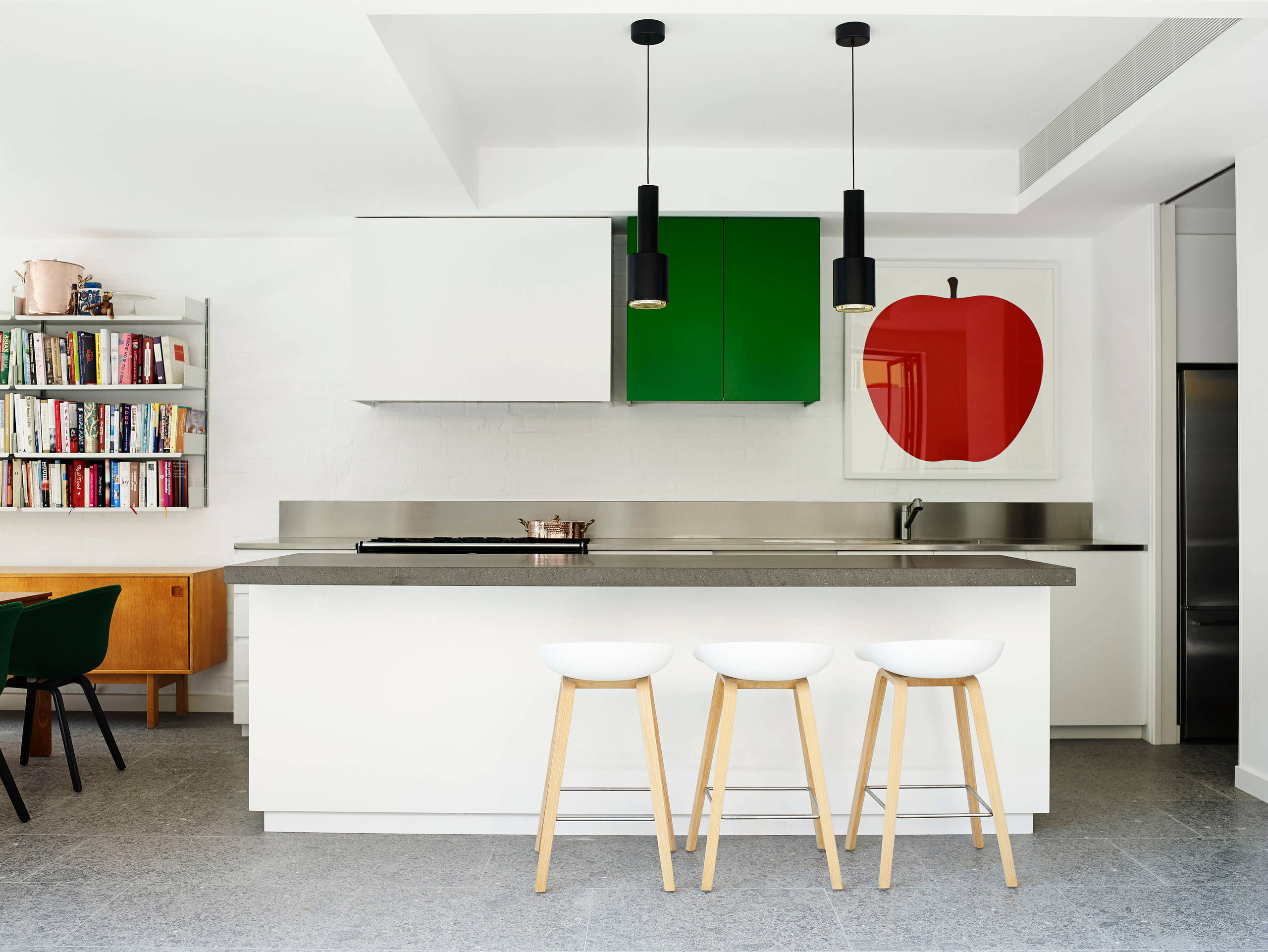 Fruit de saison rafraîchissant, la pastèque a la chair rouge et la peau vert foncé. On la retrouve ici décomposée en ces deux teintes et par touches de couleur pour cette cuisine australienne blanche. Saviez-vous que les Japonais produisent des pastèques cubiques - car cultivées en bocal ? Avec des formes figuratives (la pomme rouge aussi) ou symboliques, ces touches vitaminées s’intègrent à merveille dans un style rétro revisité.