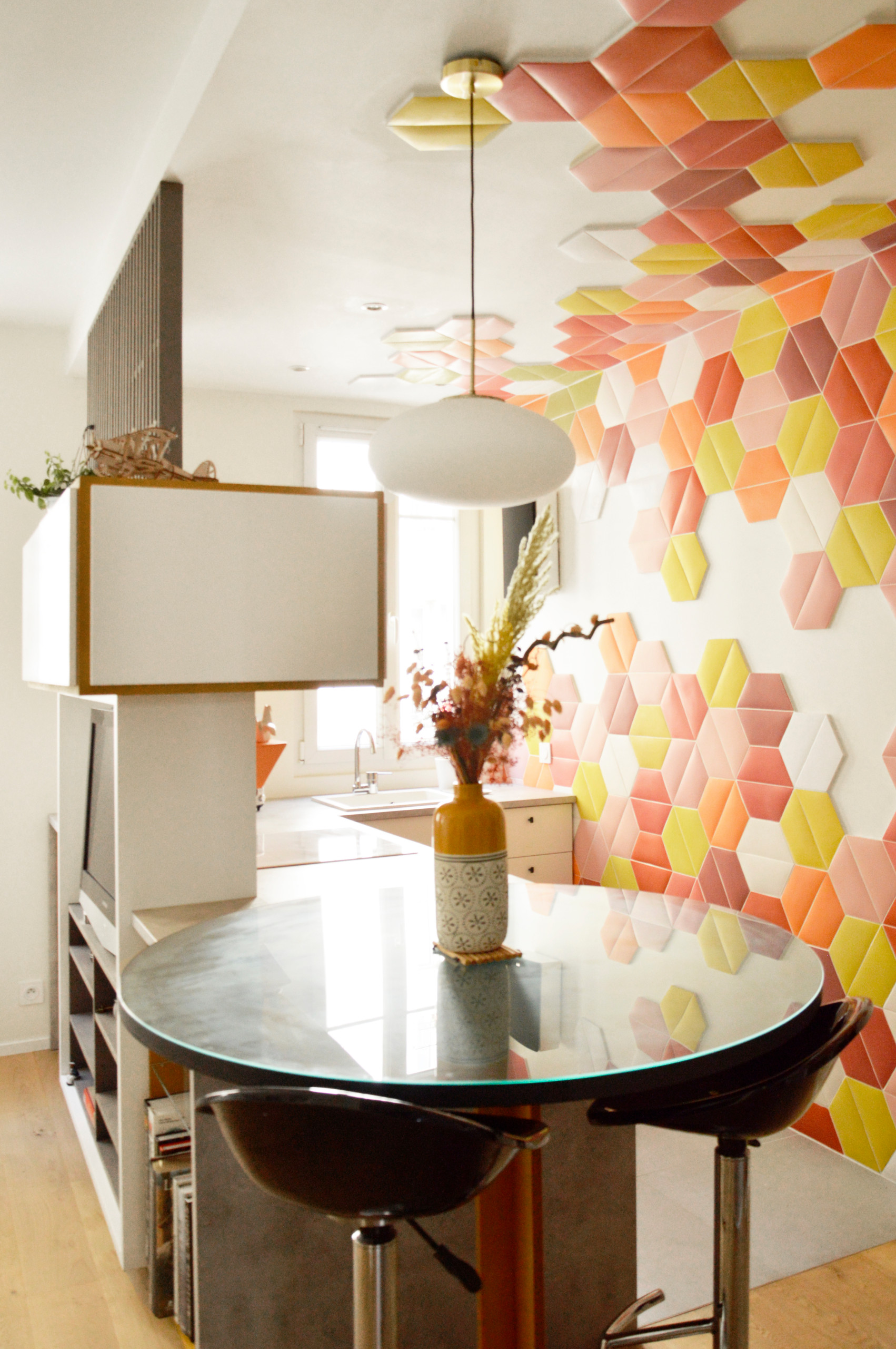 En mode rétro, comme ce premier salon de la banlieue sud de Paris qui emprunte les couleurs de la poire, du kiwi, de la pastèque ou de la noisette. Ou en mode color block groseille, banane et goyave, très contemporain pour cette entrée de l’Ouest parisien ! On ose les rectangles, les carrés et les demi-lunes fruités pour changer d’horizons.