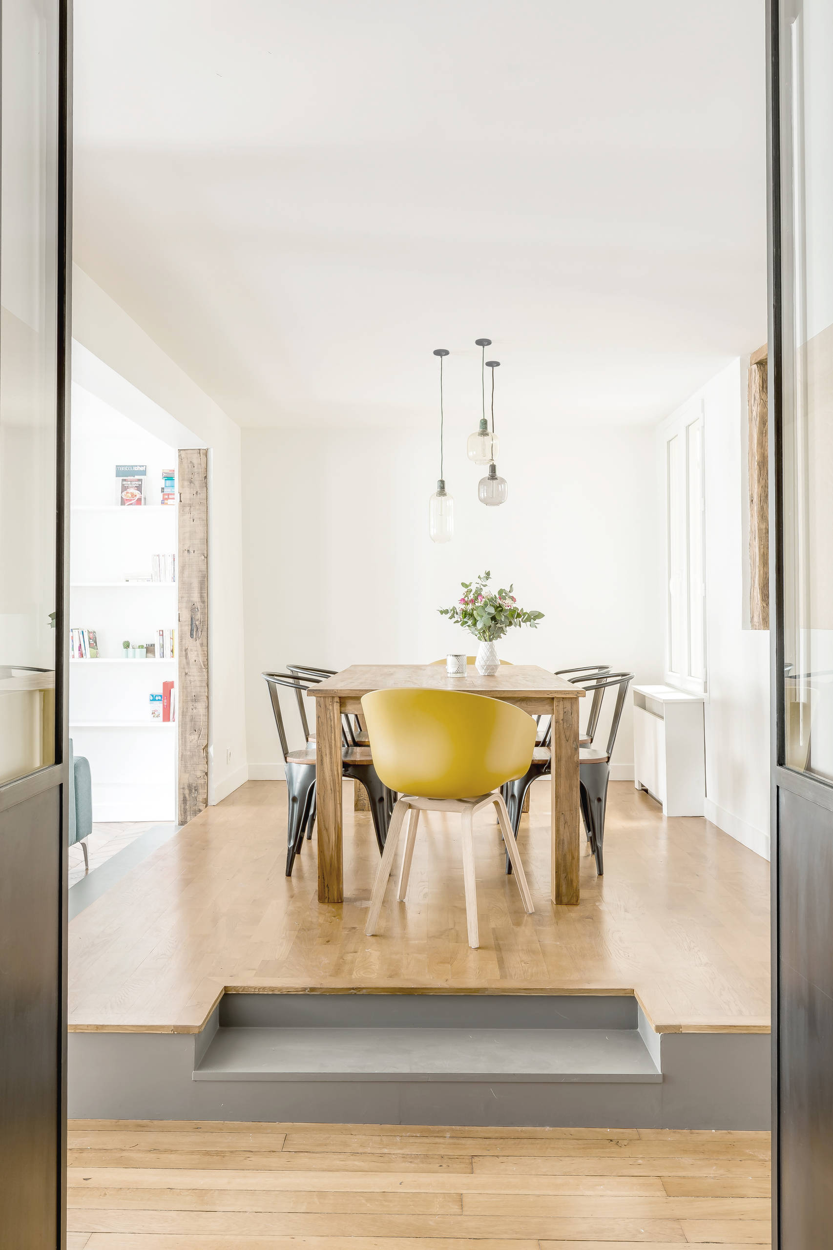 Autre possibilité : jouer sur les niveaux. Dans cet exemple très original, la légère surélévation d’une des zones distingue sans aucune cloison la salle à manger du salon.