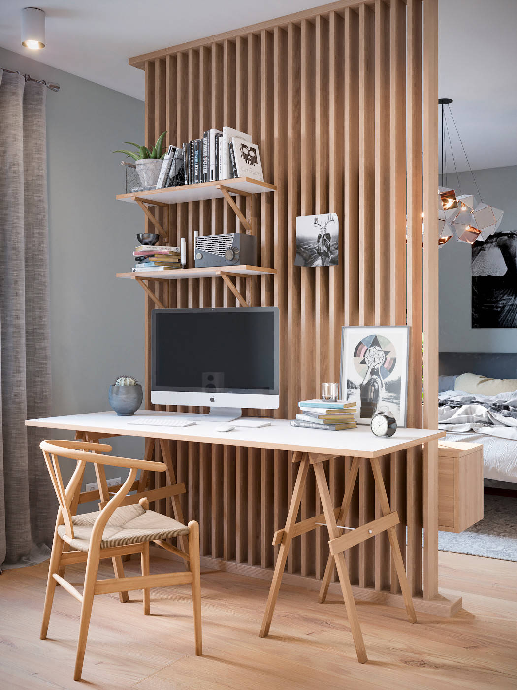 Dans cet exemple, le bois décoratif et chaleureux des claustras s’intègre avec grâce dans une chambre pour créer un coin bureau. On note aussi la position de cette séparation visuelle qui ne démarre pas contre le mur pour apporter plus de légèreté à l’ensemble.
