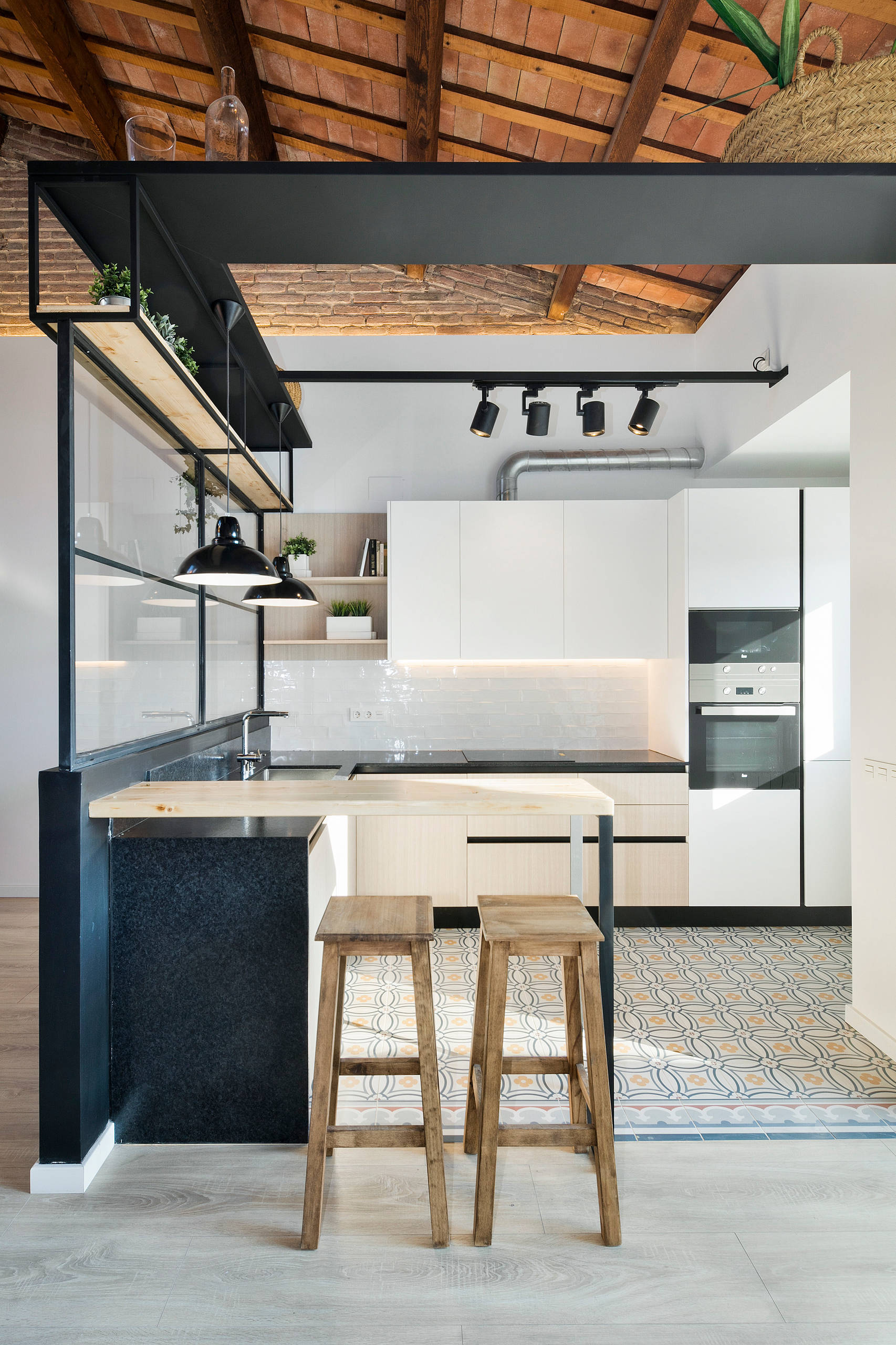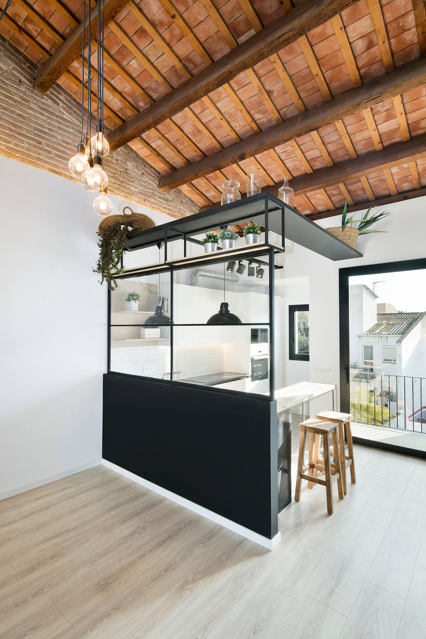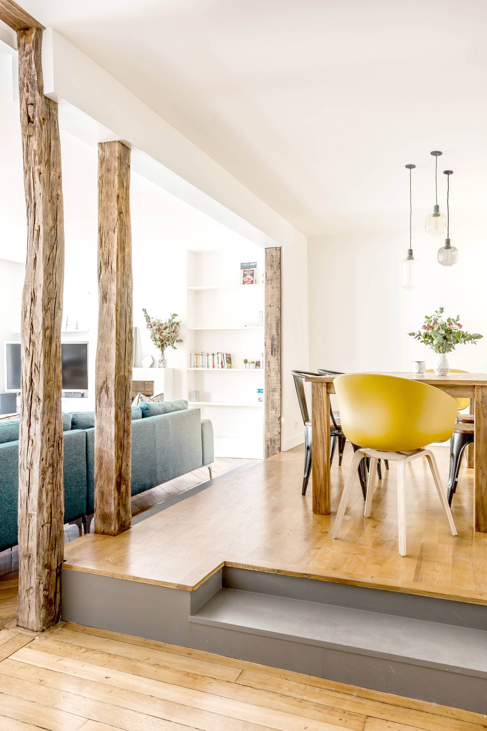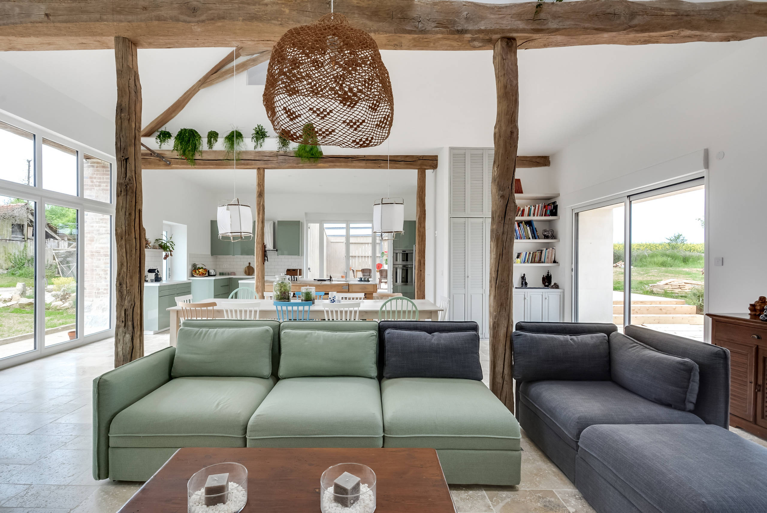 Misez sur la structure existante de votre bâtiment pour distribuer vos espaces. Ici, les poutres sont judicieusement utilisées pour séparer visuellement deux usages, le salon et la cuisine. Idéal dans les maisons anciennes pour associer le rustique au plus contemporain.