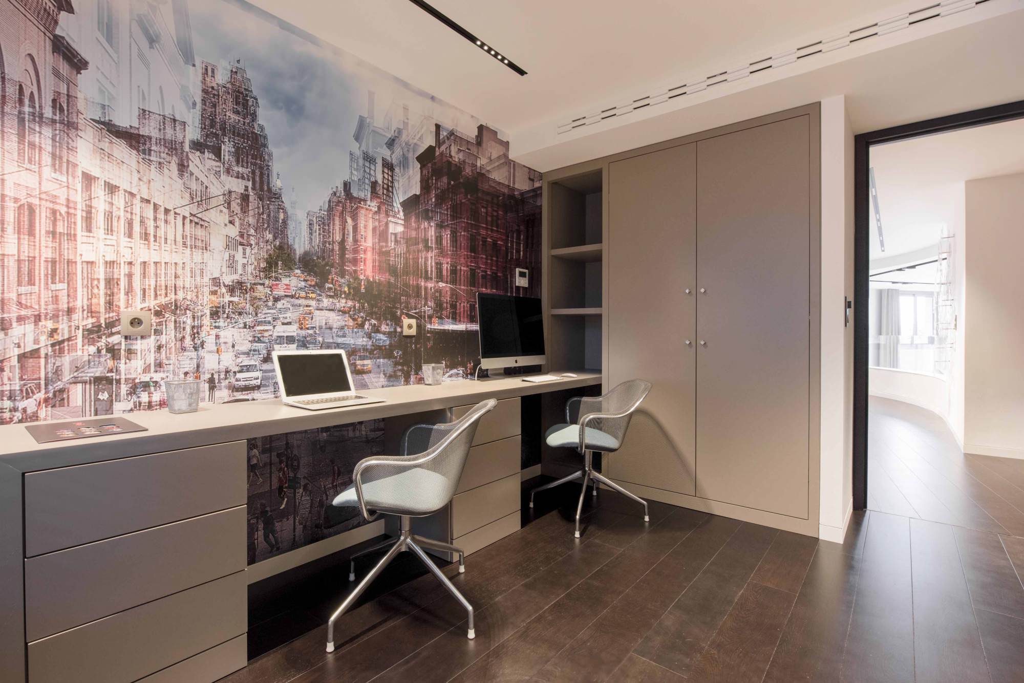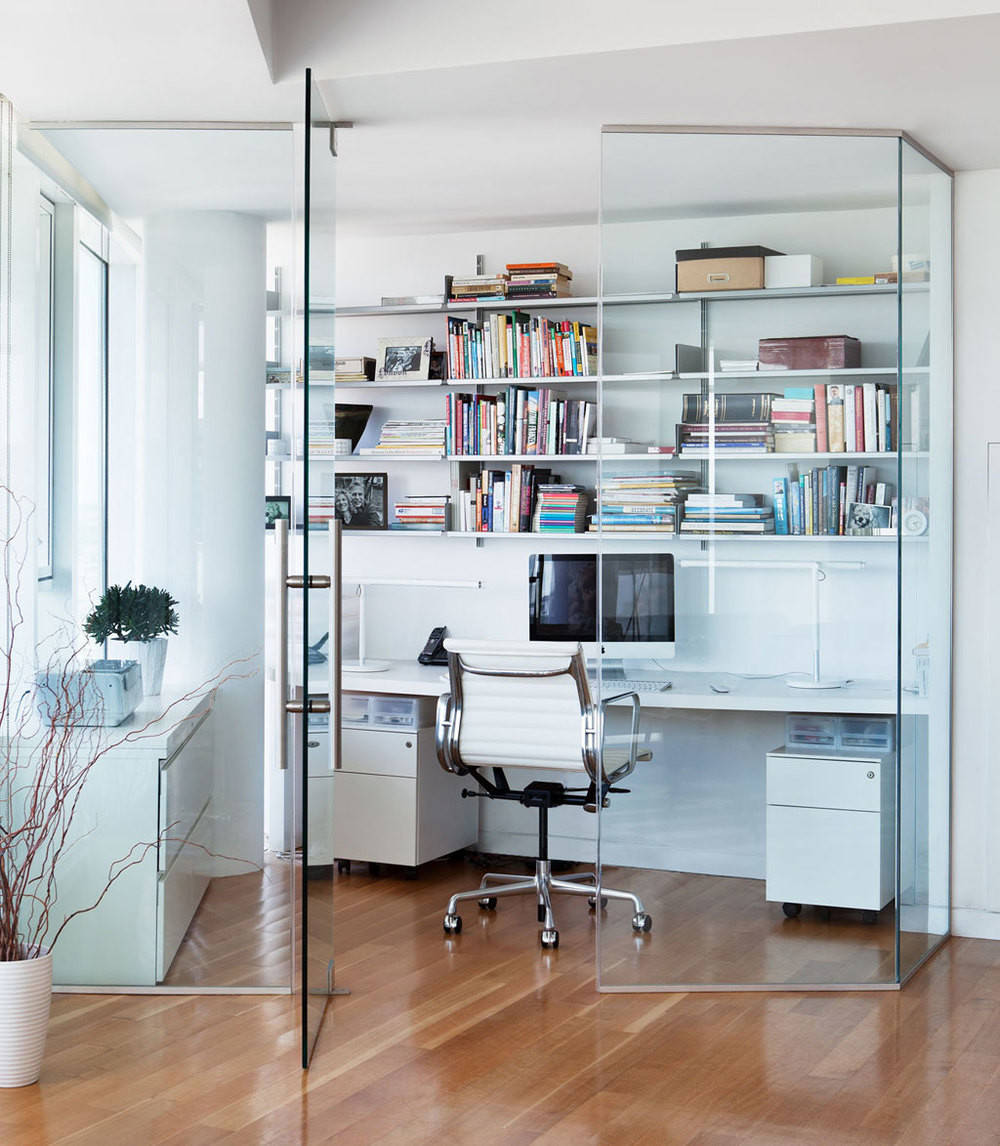 Envie d’une isolation phonique, mais pas nécessairement visuelle ? Faites installer des cloisons vitrées sur mesure. En plus d’être amovible, cette solution préserve la circulation de la lumière et la sensation de volume. Une astuce idéale pour créer, comme ici, un coin bureau à domicile sans s’enfermer.