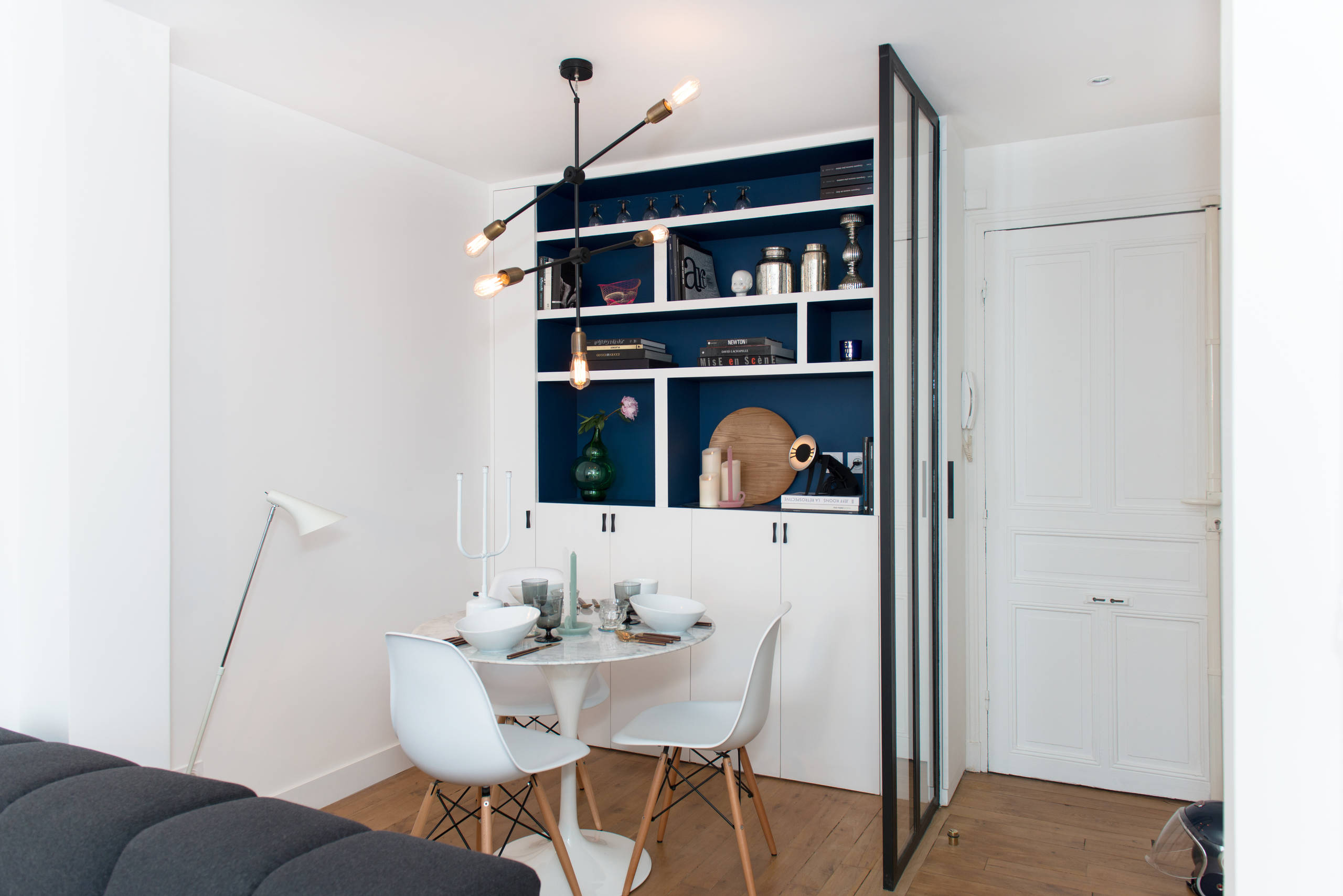 Dans ce studio, une simple étagère sépare la zone nuit du coin cuisine/repas. Adossée au mur, elle ménage cependant un espace sous le plafond. Facile à vivre et stylé à la fois !
