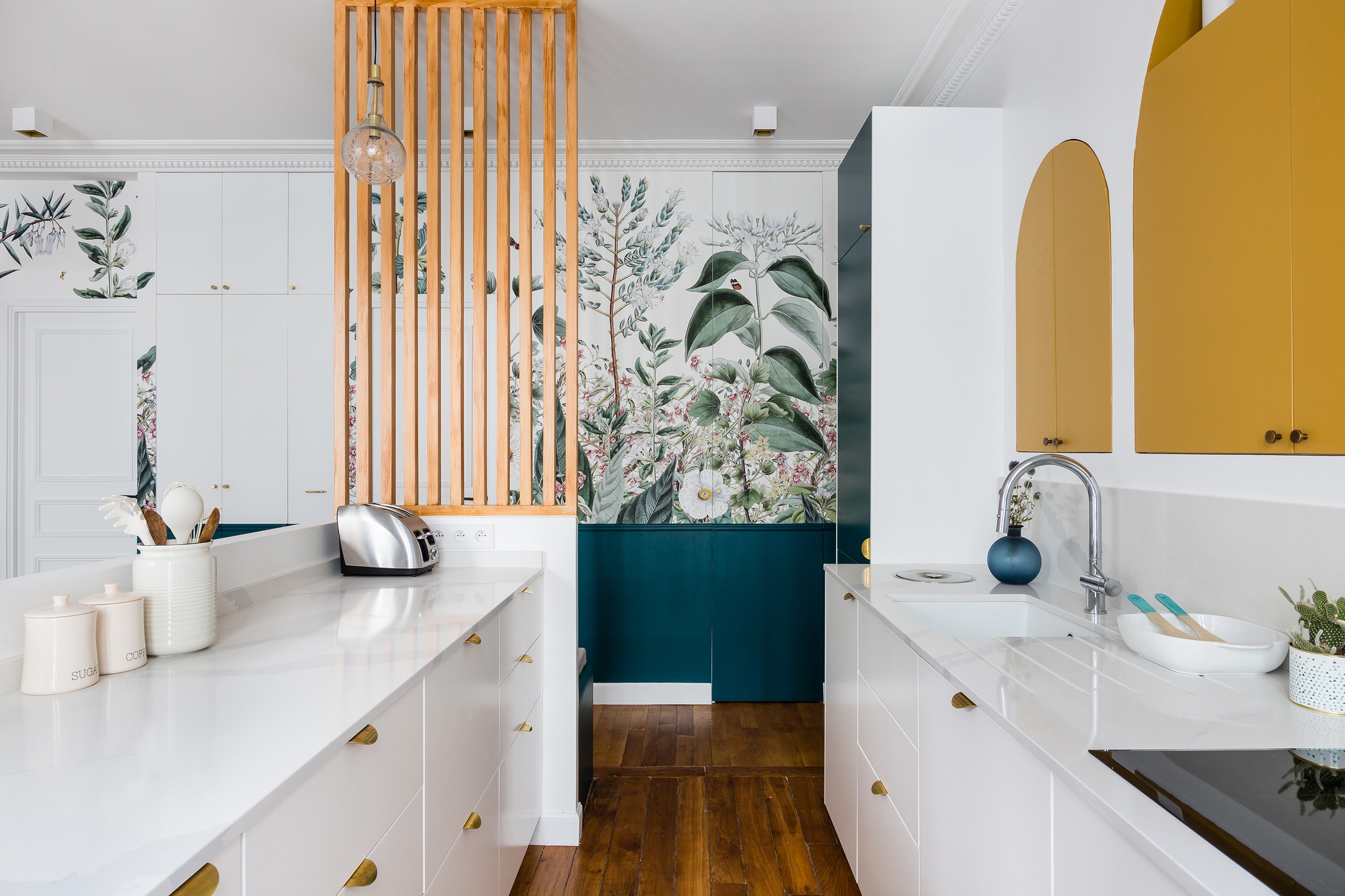 Cette première inspiration, un projet signé Wom Design, nous montre deux plans de travail parallèles, dont l’un délimite clairement l’espace cuisine du reste de la pièce. La cuisine se démarque par son ensemble harmonieux de couleurs et de matériaux : des rangements dans un vert délicat, un plan de travail en bois clair comme transition avec des murs blancs, un sol blanc qui contraste avec le parquet boisé de la pièce à vivre, et une base de plan central en briques blanches.