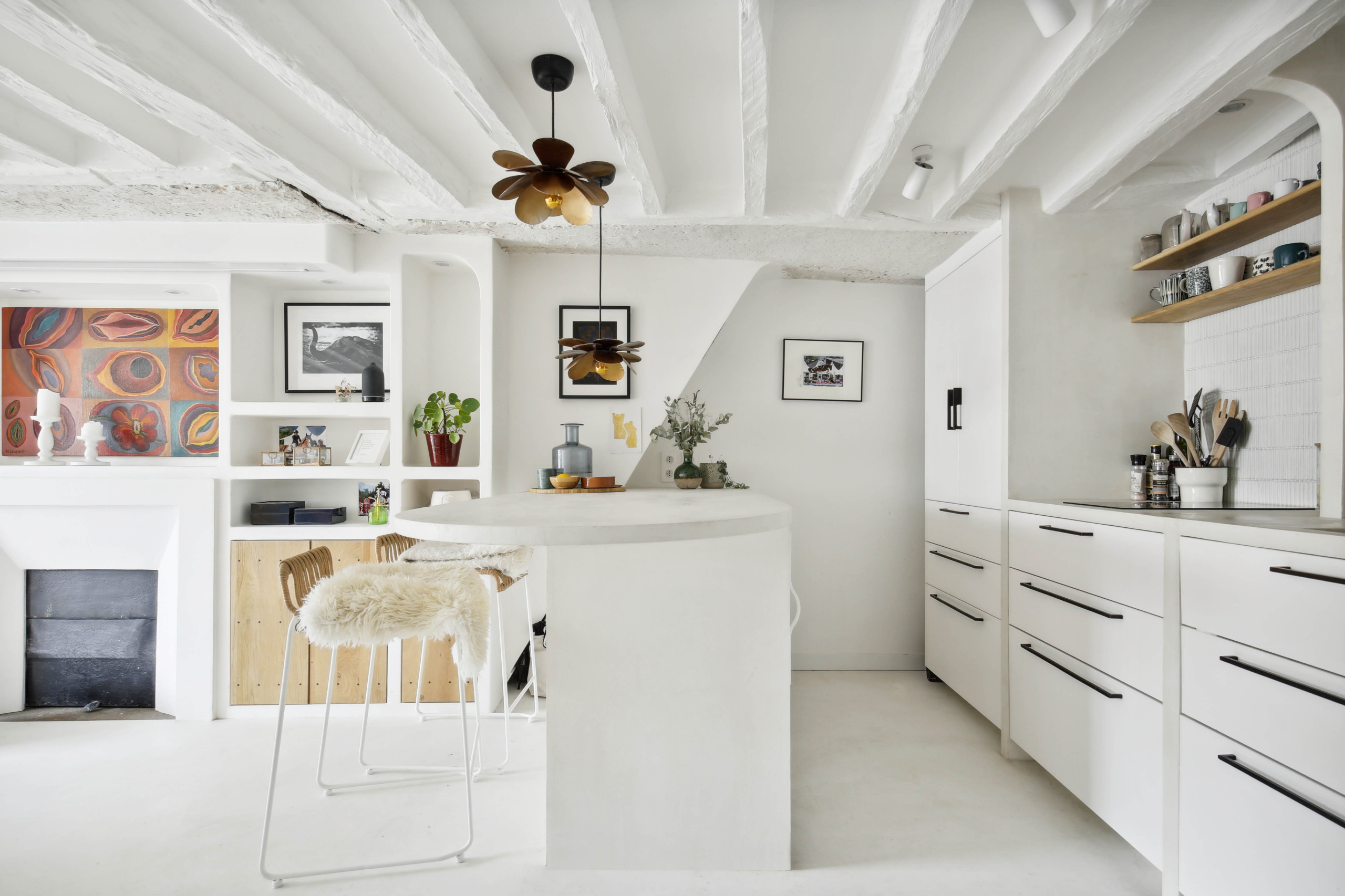 Dans cet appartement parisien à l’ambiance méditerranéenne conçu par l’agence Decodeuse, la cuisine, dont la blancheur capte toute la lumière naturelle, est sublimée par un plan en parallèle avec une extrémité en arc. Ce choix tout à fait singulier contribue à parfaire le style de cet espace de vie, en plus de garantir une fluidité de circulation. Le plan bar, en pièce phare de cet ensemble, puise toute son efficacité dans ses rangements en façade intérieure, et un plan large sous lequel prennent place les chaises.