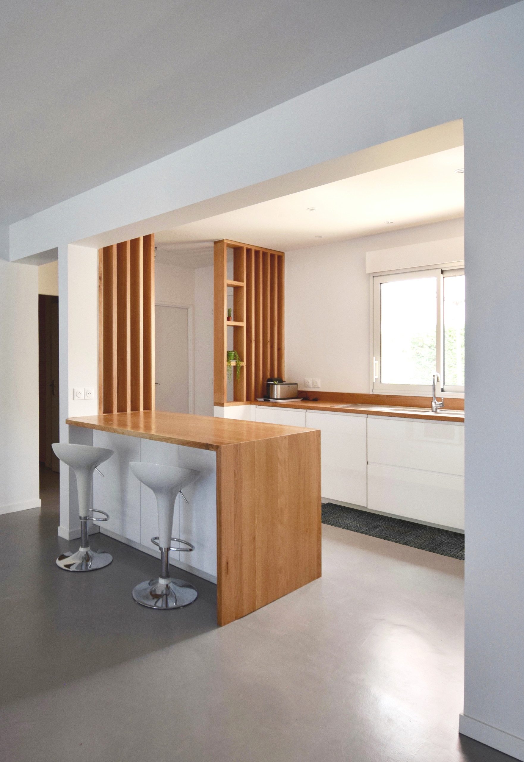 Cette cuisine ouverte parallèle à double entrée par ICØS Architecture, aménagée avec claustra et revêtement de plan de travail en bois, bénéficie d’un effet net et de continuité. Le dessus du plan bar en bois stratifié se prolonge sur la face latérale du plan pour s’ancrer visuellement. Un bel effet zigzag !