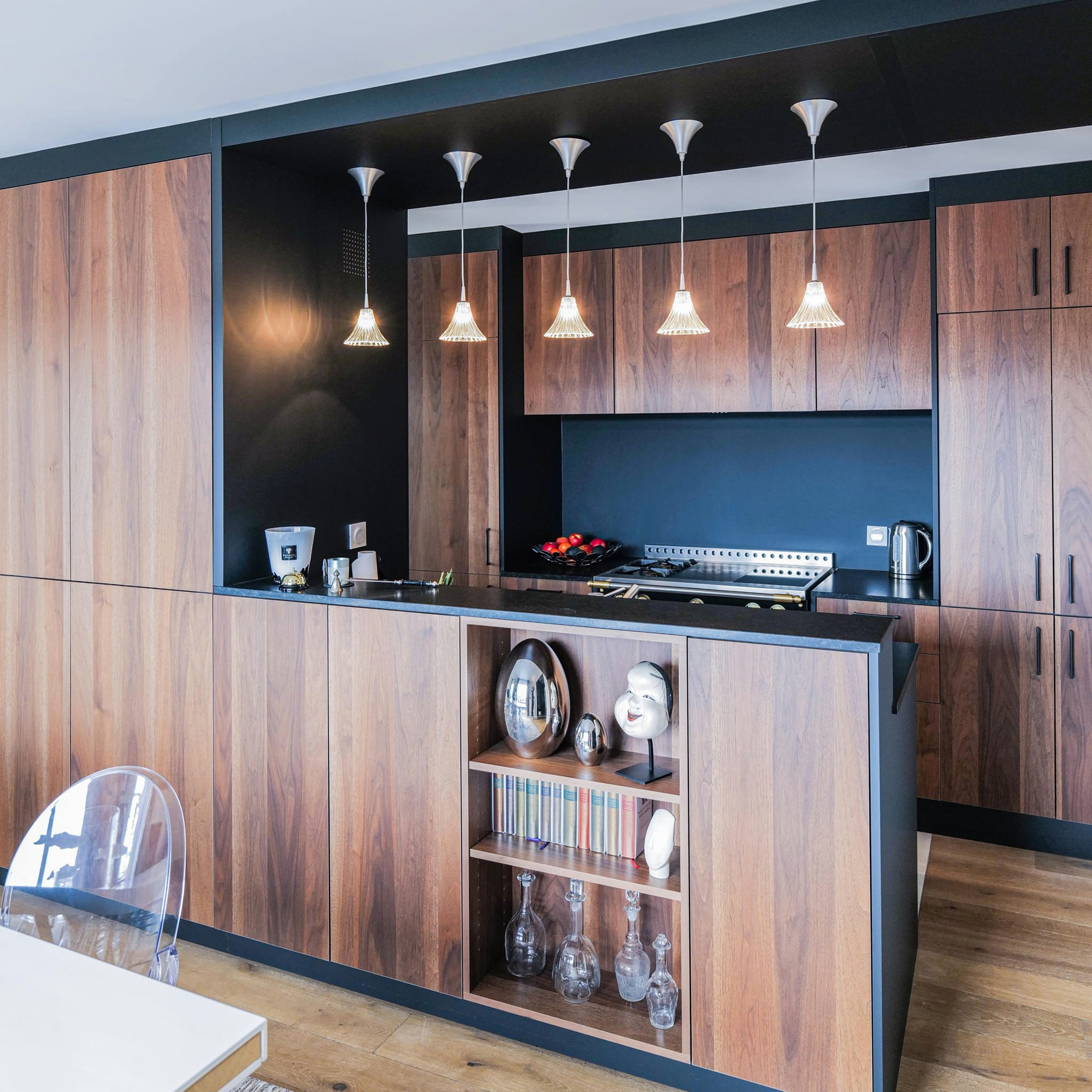 Dans cette conception réalisée par l’entreprise Agris, spécialisée dans l‘agencement et la création de mobiliers sur mesures, le détail est le maître mot. Le plan bar intègre des rangements sur chaque façade pour créer un bel effet visuel, chic et fonctionnel. Le tout boisé, allié au noir, permet une cohérence d’ensemble entre le plan bar, le plan de travail et les façades.