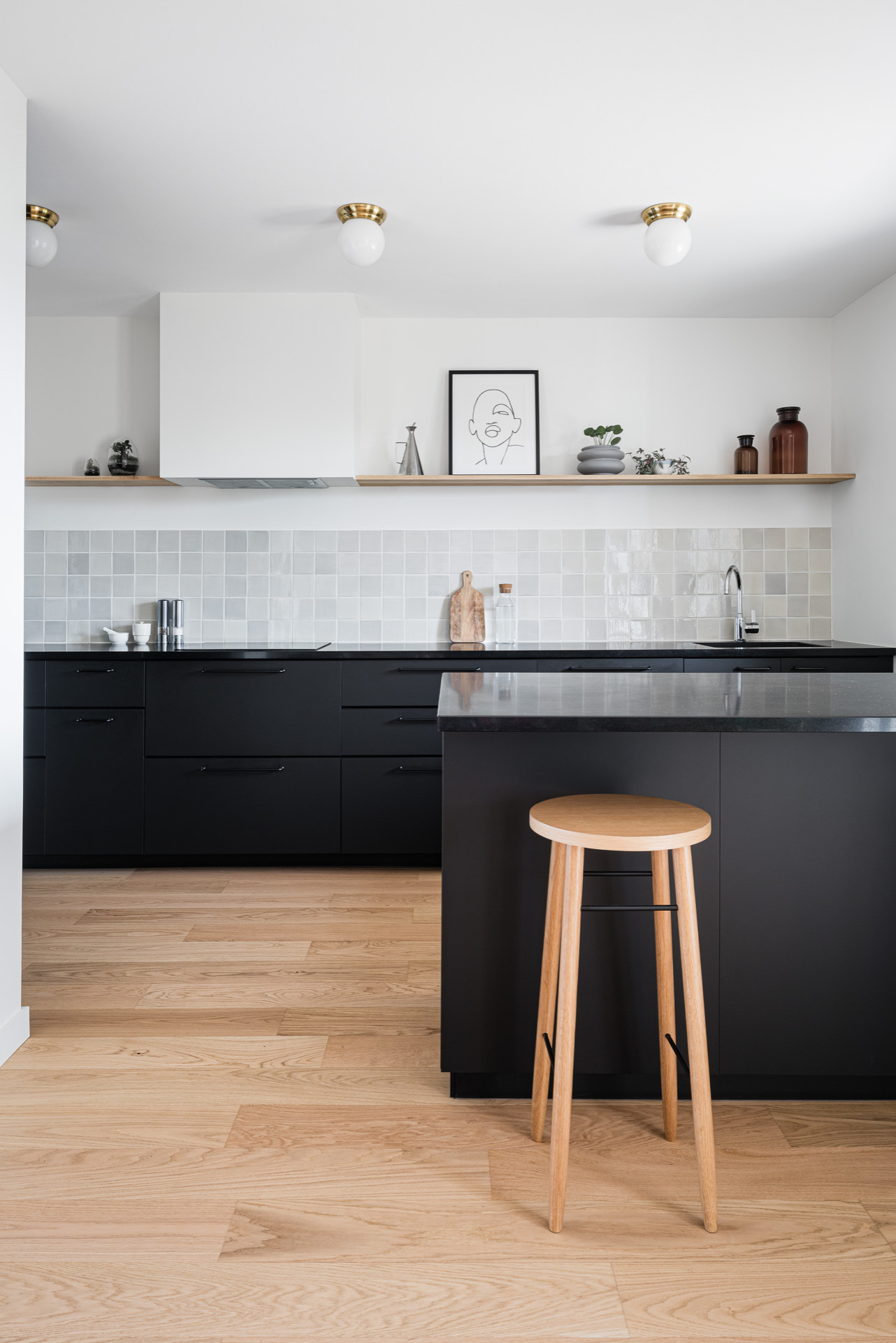 Margot Le Métayer, cette cuisine est tout aussi esthétique qu’efficacement agencée. La couleur noire crée un effet de continuité entre le plan de prolongement parallèle et le plan de travail longeant le mur.