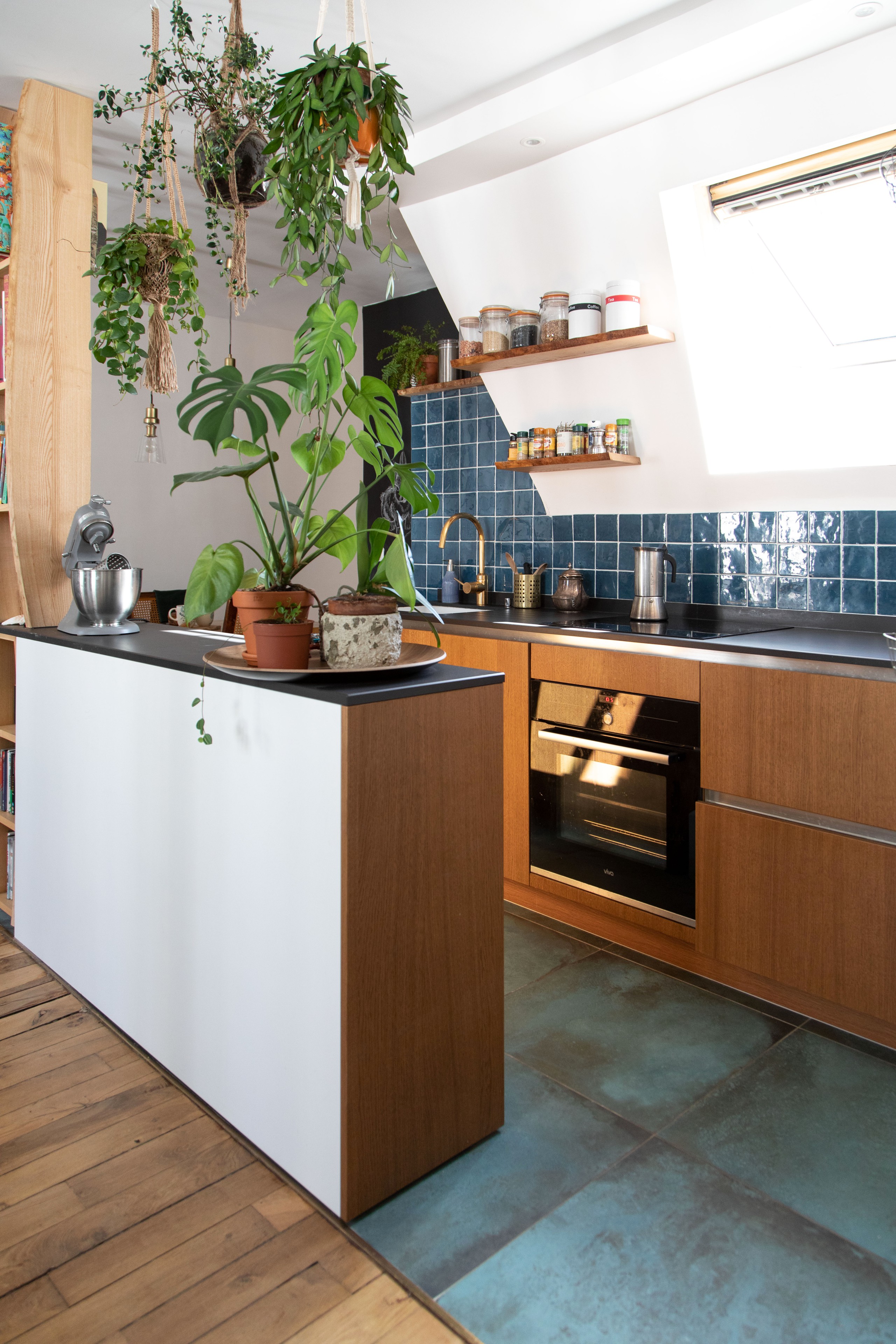 Dans cette réalisation pleine de charme et de simplicité signée par la société Mon Concept Habitation, la contrainte d’espace est bien gérée. Fruit d’un projet avec des élèves architectes, un petit plan de travail parallèle a été pensé en guise de prolongement et de délimitation, pour accroître la capacité de stockage de manière astucieuse. Les carreaux bleus alliés à des matériaux naturels comme le bois et les grandes plantes décoratives créent un style provincial inspirant.