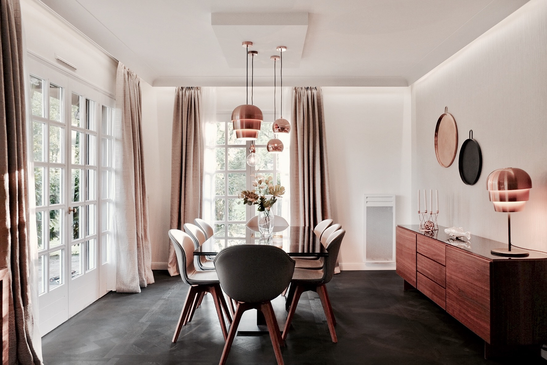Nous voici dans un salon sobre et chic imaginé par l’Atelier Caroline Durst. Sol noir, murs clairs, une porte-fenêtre et une baie vitrée, toutes deux à croisillons, qui, en rez-de-jardin, laissent voir pelouse et arbres. C’est une pièce cosy et feutrée avec ses lourds rideaux beiges, ses chaises rembourrées et la dominance de deux matériaux chauds et automnaux : bois et cuivre. Répondant au bois foncé des meubles aux teintes sourdes et denses, le cuivre, dans la même gamme, apporte une touche d’éclat avec le plateau rond au mur, la lampe et surtout les nombreux éclairages centraux : suspensions de taille différentes, toutes tenues au plafond par des disques de cuivre. La plus volumineuse a un jeu de formes en emboîtement identique à celle posée sur la commode. Le tout structure et réchauffe la pièce, tandis qu’un vase garni de feuilles au centre de la table sombre et lustrée complète l’atmosphère naturelle.