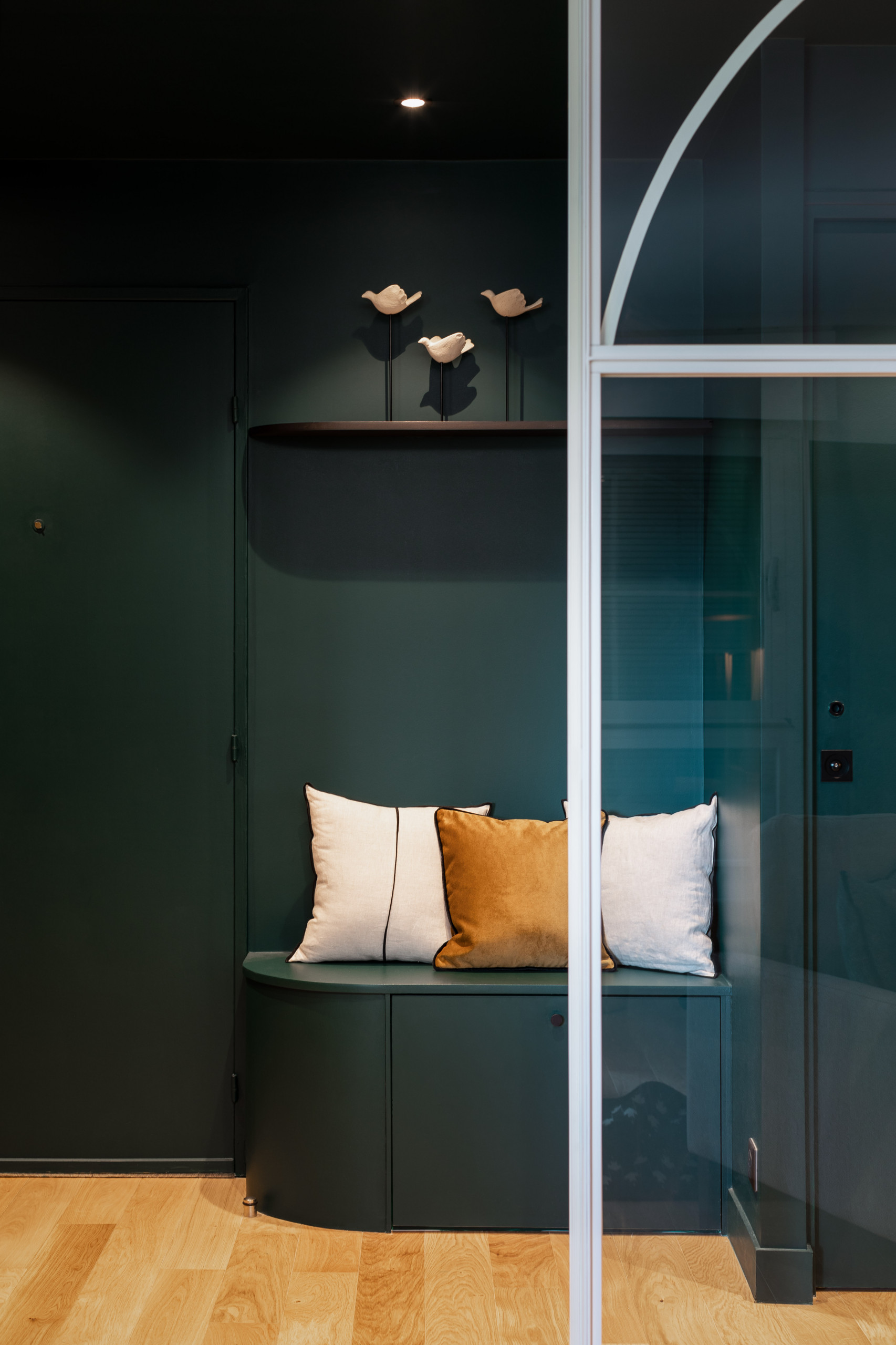 Pour ce pied-à-terre parisien, l’Atelier Germain a misé sur des couleurs fortes et notamment sur un magnifique vert forêt, intense et profond. Ainsi en est-il dans cette entrée, atypique et colorée, très immersive pour le nouvel arrivant. Afin de lui donner l’instant nécessaire pour poser ses affaires ou se déchausser, une petite banquette confortable a été prévue, agrémentée d’un trio de coussins, blancs aux extrémités et cuivre au centre, seule décoration avec un autre trio, celui des petites sculptures blanches d’oiseaux en hauteur. Le cuivré, bien mis en valeur par le voisinage du blanc, apporte le point d’orgue parfait à cet envoûtement de vert profond et donne pile la touche de chaleur attendue pour compléter l’impression de confort et d’accueil.