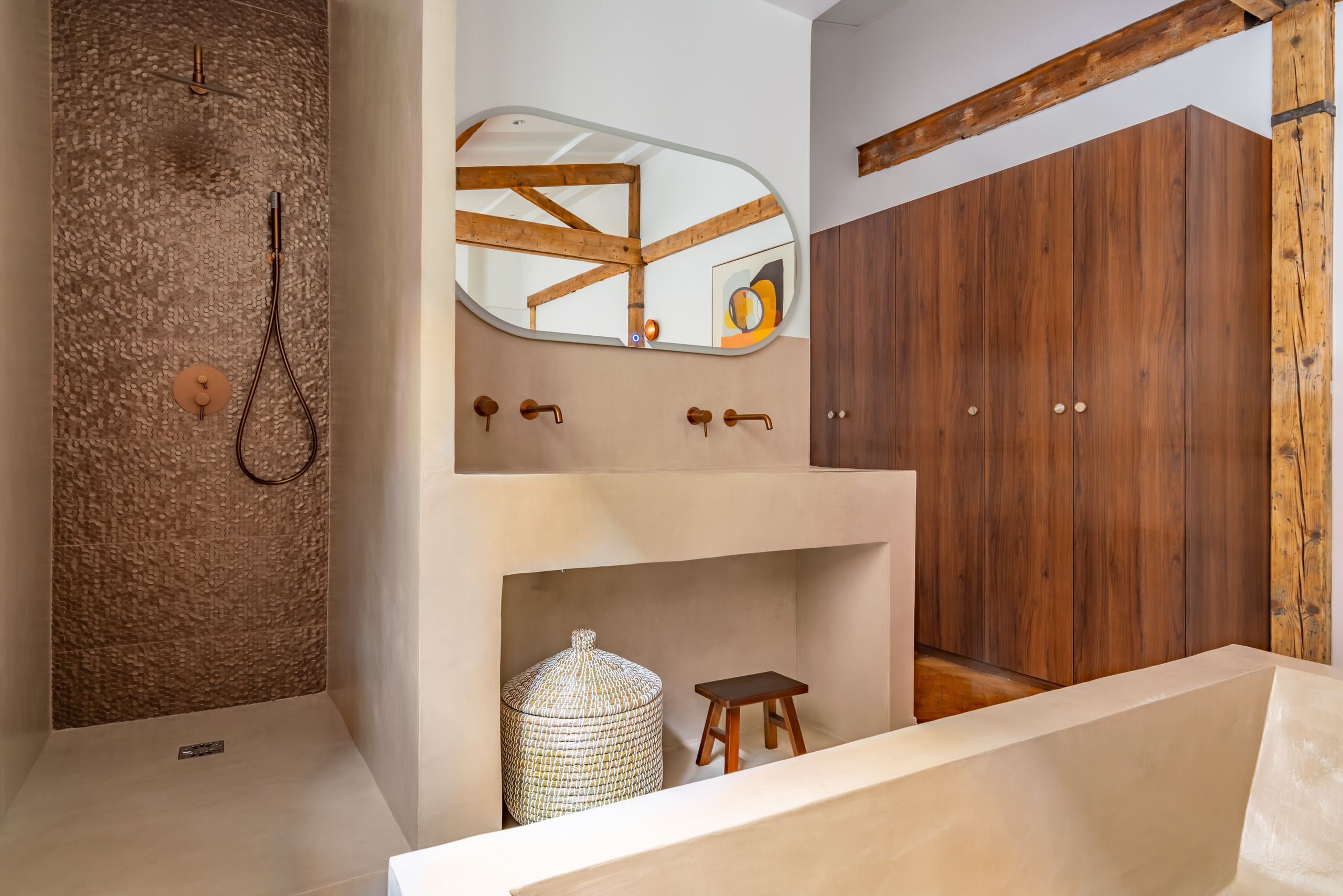 Dans ce projet de Studio Junéa, avec une salle de bains ouverte sur le séjour, la cabine de douche, placée en retrait, s’enrichit d’un carrelage couleur cuivre, aux formes petites, rondes et brillantes, comme si la paroi se recouvrait d’un scintillement de pièces de monnaie. L’ensemble de cette salle d’eau est maçonné avec un béton choisi dans des tons chauds de brun biscuit clair, déclinaison délicate en accord avec ce carrelage qui revêt la douche et la baignoire, ainsi qu’avec les robinetteries cuivrées. Et l’association du cuivre avec la gamme des bruns clairs et des beiges fonctionne parfaitement. Le fond carrelé de la cabine est plus sombre et foncé que le béton, ce qui cadre avec l’intimité à laquelle la zone de douche est vouée ; mais l’éclat chaud du cuivre évite la morosité et donne une note élégante à cette paroi de fond. Le tout est chaleureux et raffiné, terrestre et solaire à la fois.