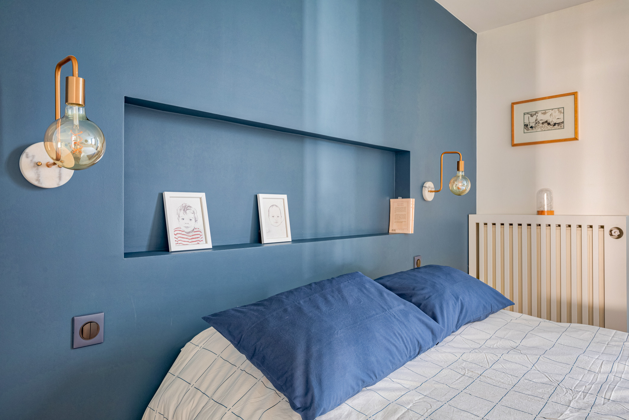 On découvre ici, avec le travail de Charlotte Astruc, l’association presque toujours gagnante que forment le cuivre et les bleus. Outre la complémentarité des tons, cuivre et bleu apportent tous deux de la douceur dans une pièce, bien que les tonalités du premier soient chaudes et celles du second, froides. Ici, le bleu est en vedette avec un mur bleu acier et une literie blanche quadrillée de lignes bleues et ornée de coussins myrtille. Les appliques d’éclairage à tige cuivre, créant la symétrie de part et d’autre de ce lit surplombé d’une niche de rangement, ressortent avec intensité sur ce fond bleu. Au contraire des interrupteurs, choisis pour se fondre à la couleur du mur, leur base, un disque marbré ponctué de deux clous à tête cuivrée, se détache avec élégance. Cuivre et marbre apportent à cette pièce simple et discrète une fine touche de luxe intemporel.