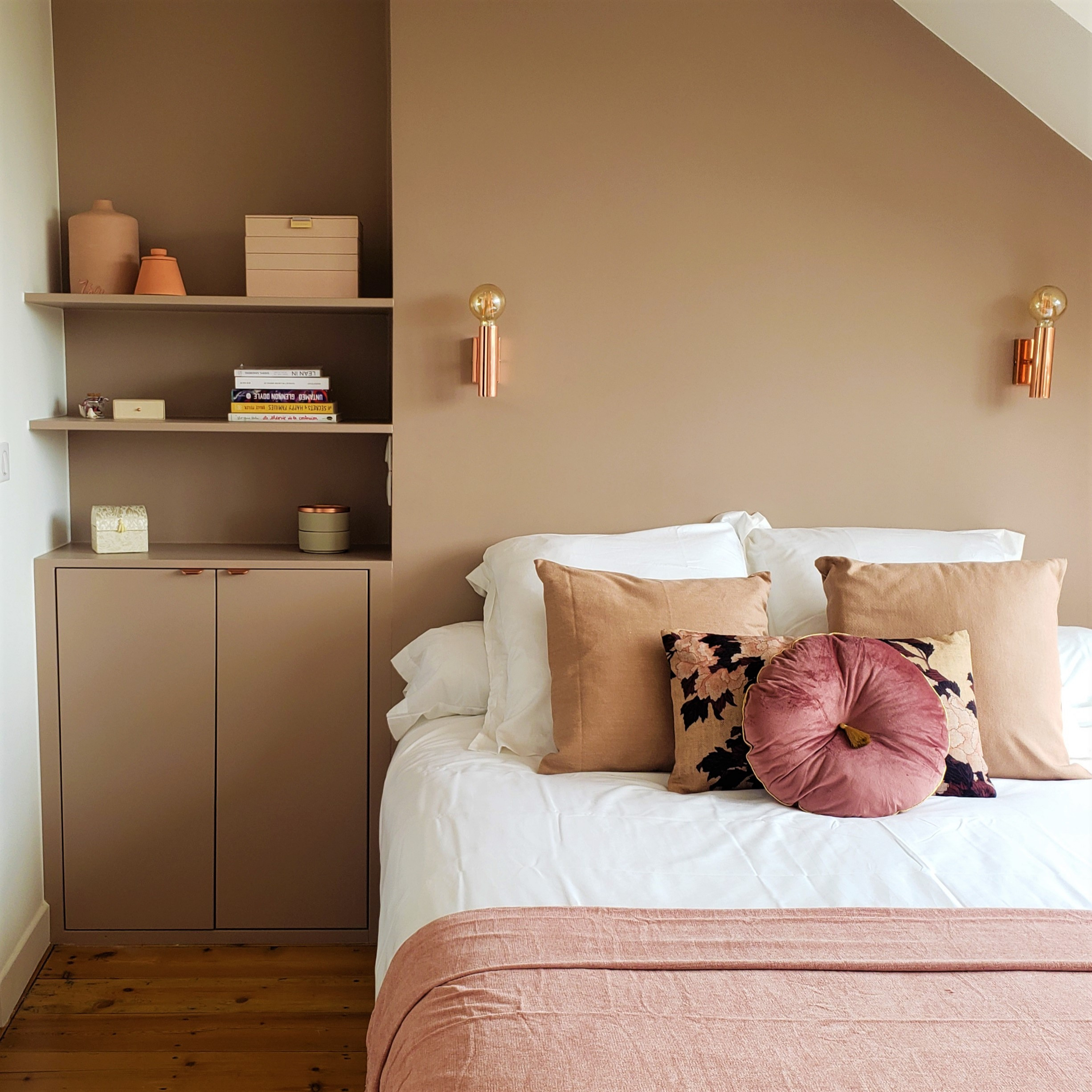 Dans cette rénovation, l’Atelier Bushido a choisi des notes de cuivre douces pour la chambre. Les appliques de lit et poignées de meuble cuivrées s’incorporent à un nuancier subtil : leur couleur se répercute en dilué sur la literie, puis s’allège encore sur les murs, aux tons de sable. Le jeu de coussins est travaillé dans les formes comme dans les couleurs : le cuivre sert de fond, le noir crée un motif, et un coussin framboise à pompon central cuivré couronne cette composition textile. Les objets de décoration de l’étagère sont en harmonie avec l’ensemble, grâce à leurs notes de terre et de bois. L’atmosphère est douce, avec des teintes se rapprochant du nude, de la chair, du poudré, créant une sensation de délicatesse et d’intimité.