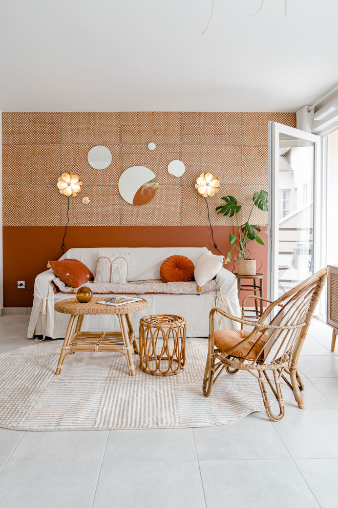 Ce séjour d’un appartement nantais refait par Lucie Rouland a des allures d’été indien avec son mobilier léger en rotin et ses couleurs cuivrées mates, aux tons de sable chaud et de miel brun. En fond, un mur dont la moitié inférieure est recouverte d’un cuivré dense et uni, et dont la moitié supérieure reprend cette couleur dans un quadrillage, en panachage avec de minuscules carreaux crème – astuce qui, éclaircissant la pièce vers les hauteurs, donne l’impression de l’y élargir. Entre ce papier peint, le tapis et les coussins, le jeu des textiles donne à la pièce de la douceur et un côté cosy. Les notes chaudes de caramel des coussins cuivrés sur le canapé parachèvent l’allure confortable et accueillante de ce séjour.