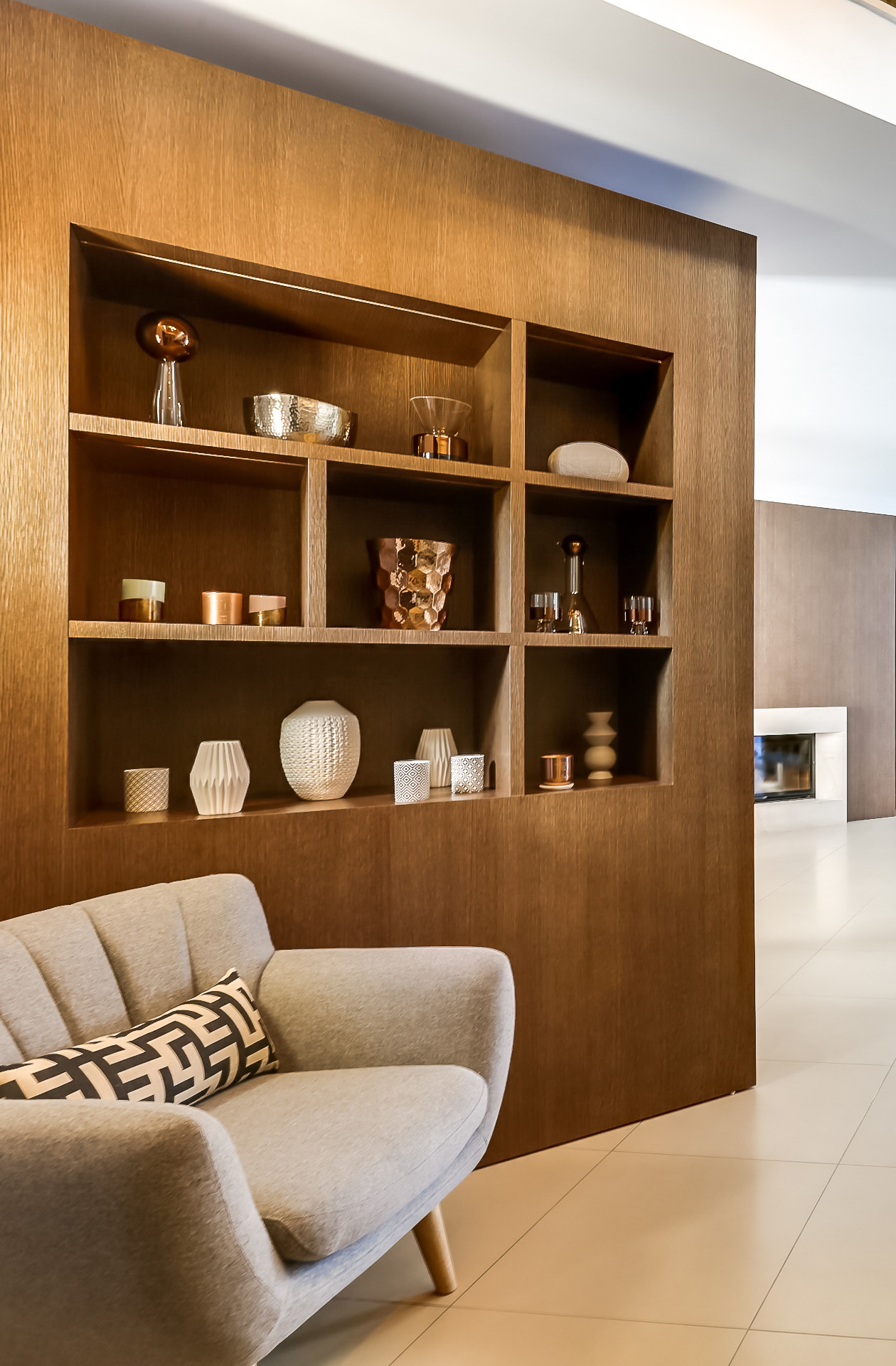 Ici, avec Anne Chemineau de Decor Interieur, les propriétaires ont choisi de valoriser leur collection de cuivres moderne et designée dans une étagère dédiée, en bois, et en la mêlant à leurs porcelaines. Se crée alors un jeu de textures et de formes qui, grâce à la discrétion des couleurs – porcelaines et cuivres sont ici des objets unis – agrémente la vue sans la surcharger. Lustrés, les cuivres étincellent, qu’ils soient cylindriques avec des reflets très lisses ou martelés et bosselés, avec un effet de lumière éclatée. Les contours des objets, mêlant cônes, cylindres, ou formes ovalisées, sont dans des géométries simples, mais leurs variations créent pour le regard un tableau délassant, à la fois précis et complexe.