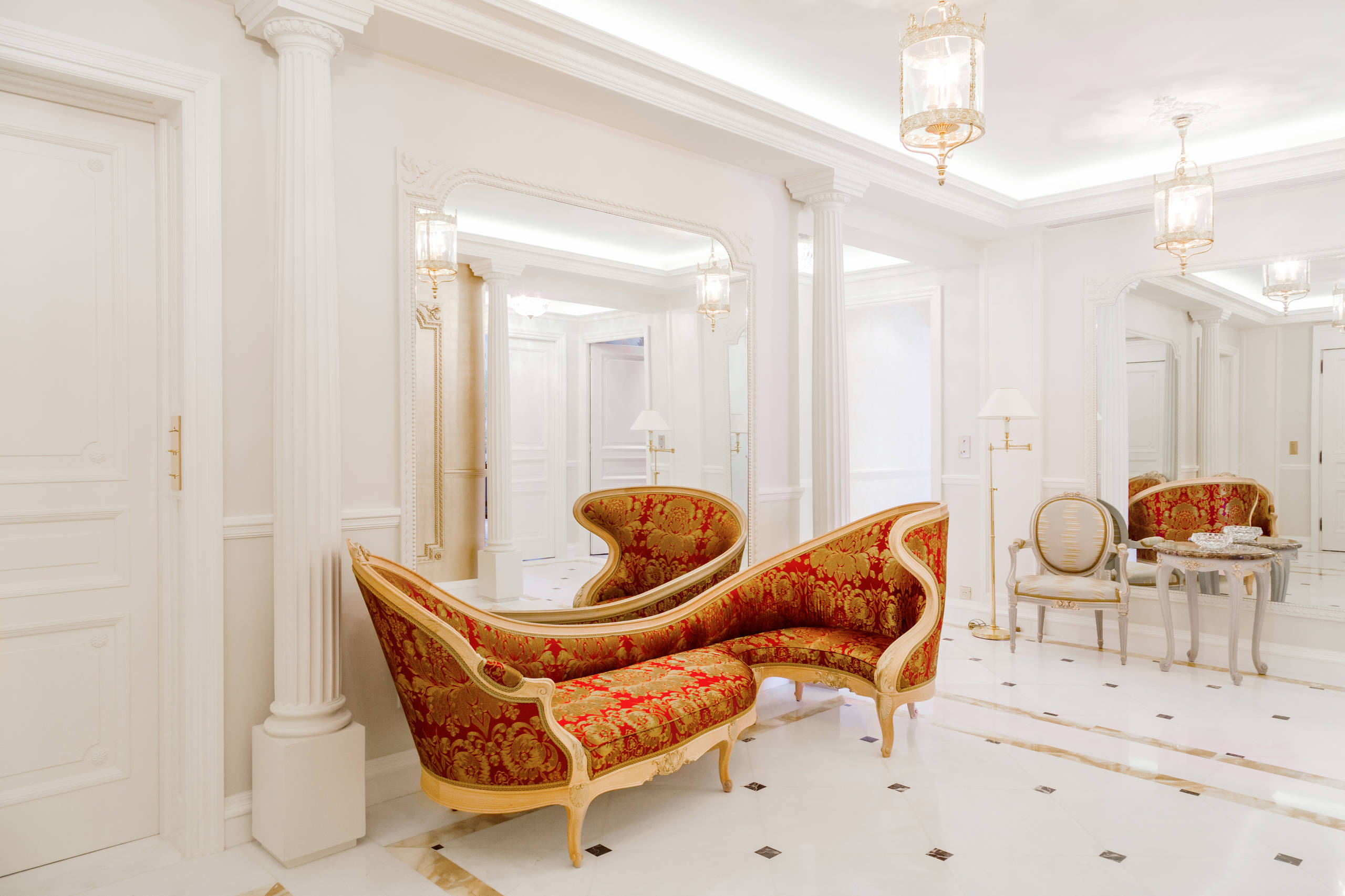 Ci-dessus, dans un appartement de l’avenue Montaigne à Paris, une famille saoudienne s’est offert les services de l’ébéniste d’art Dissidi pour faire réaliser ce canapé pourpre et or placé dans l’entrée. Étonnement et admiration garantis !