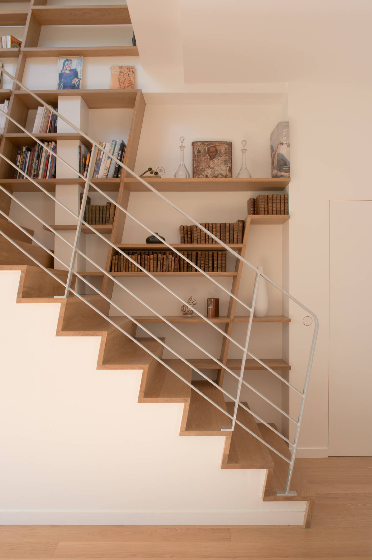 Dans cet escalier, il aurait été impossible de loger une bibliothèque trouvée dans le commerce. Celle qu’a imaginée Mélanie Lallemand combine intégration parfaite, optimisation et originalité grâce au sur-mesure.