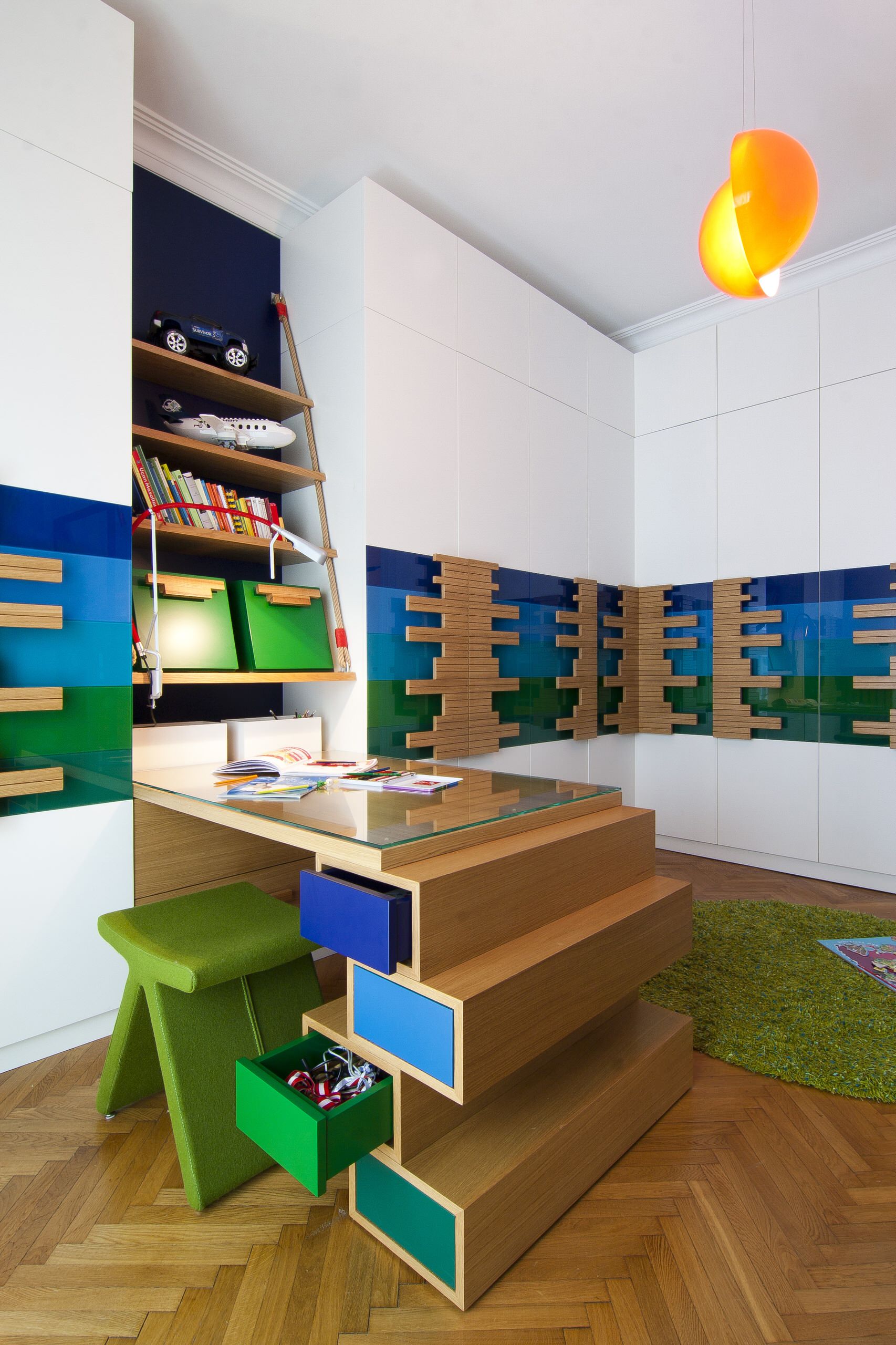 Dans le même esprit, ce bureau d’enfant, dont le décor et les couleurs sont rappelés sur les portes des rangements, montre bien comme le sur-mesure peut faire vivre vos rêves ou ceux de votre enfant.