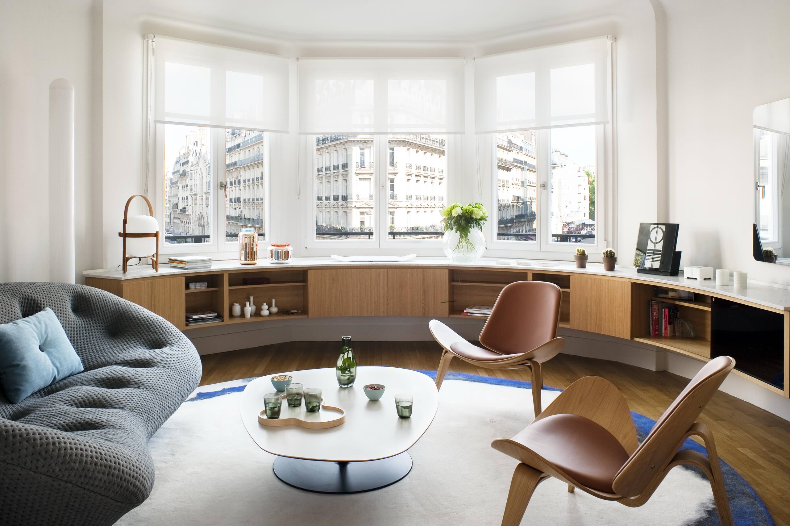 Quand la topographie des lieux invite à la fluidité, comme cette rotonde lumineuse, il est judicieux de renforcer cette sensation. Le choix d’un mobilier sur mesure aux lignes courbes renforcera cette sensation de douceur presque aquatique, où le regard coule d’un élément à l’autre. Rien ne le stresse ni ne l’arrête.