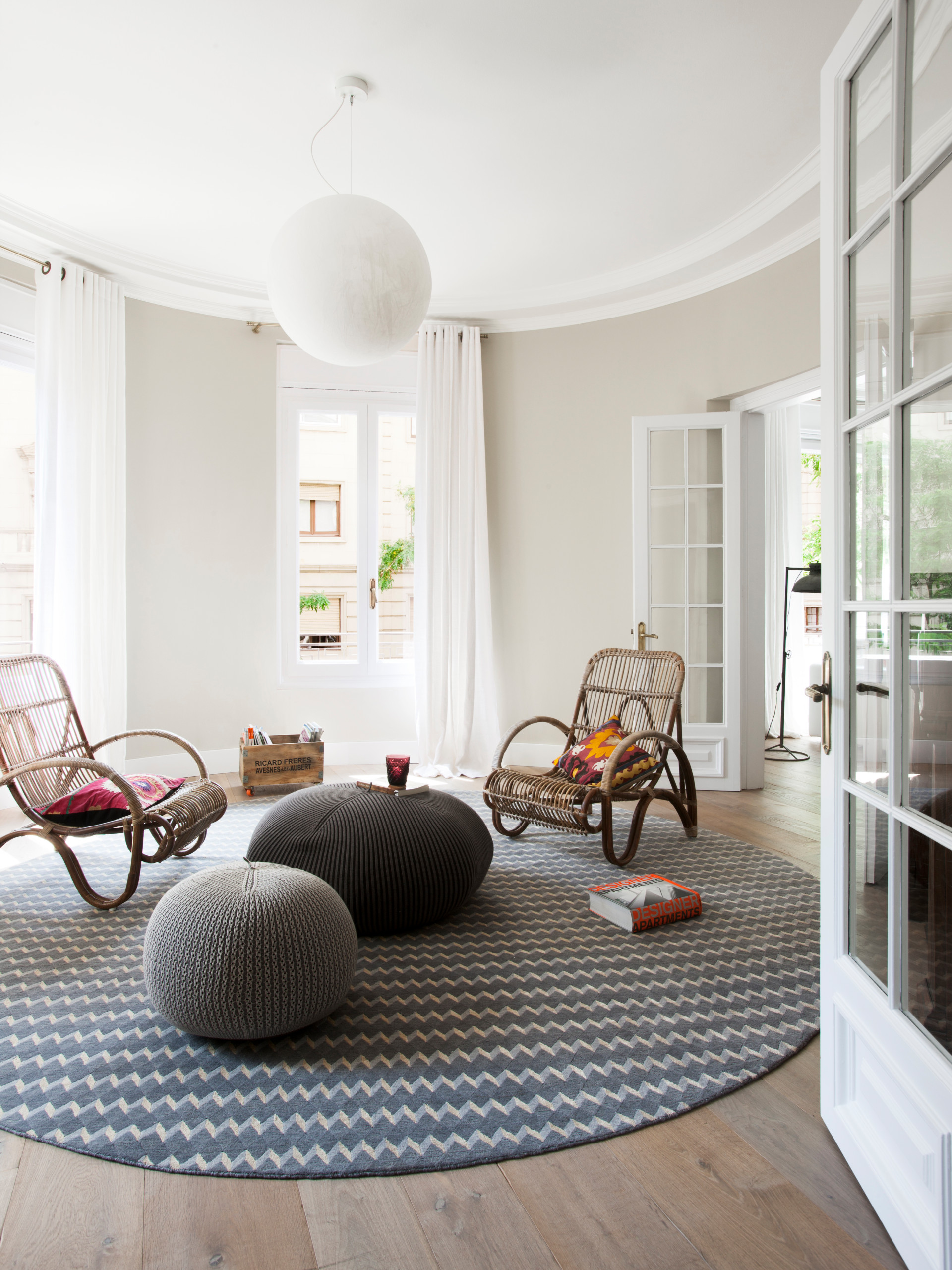 Le style organique n’aime pas l’accumulation, ni le désordre : la sobriété est de mise, avec des éléments forts comme ces gros poufs « rochers » qui symbolisent un îlot au centre de ce salon lumineux et circulaire. Ce style réinvente souvent la circulation et l’agencement d’une pièce : ainsi, contrairement à nos habitudes, les meubles ne sont plus collés aux murs, mais s’autonomisent au milieu de la pièce, formant dans la mesure du possible des pôles de fonction (la lecture, le repas, la détente…) pour libérer la circulation.