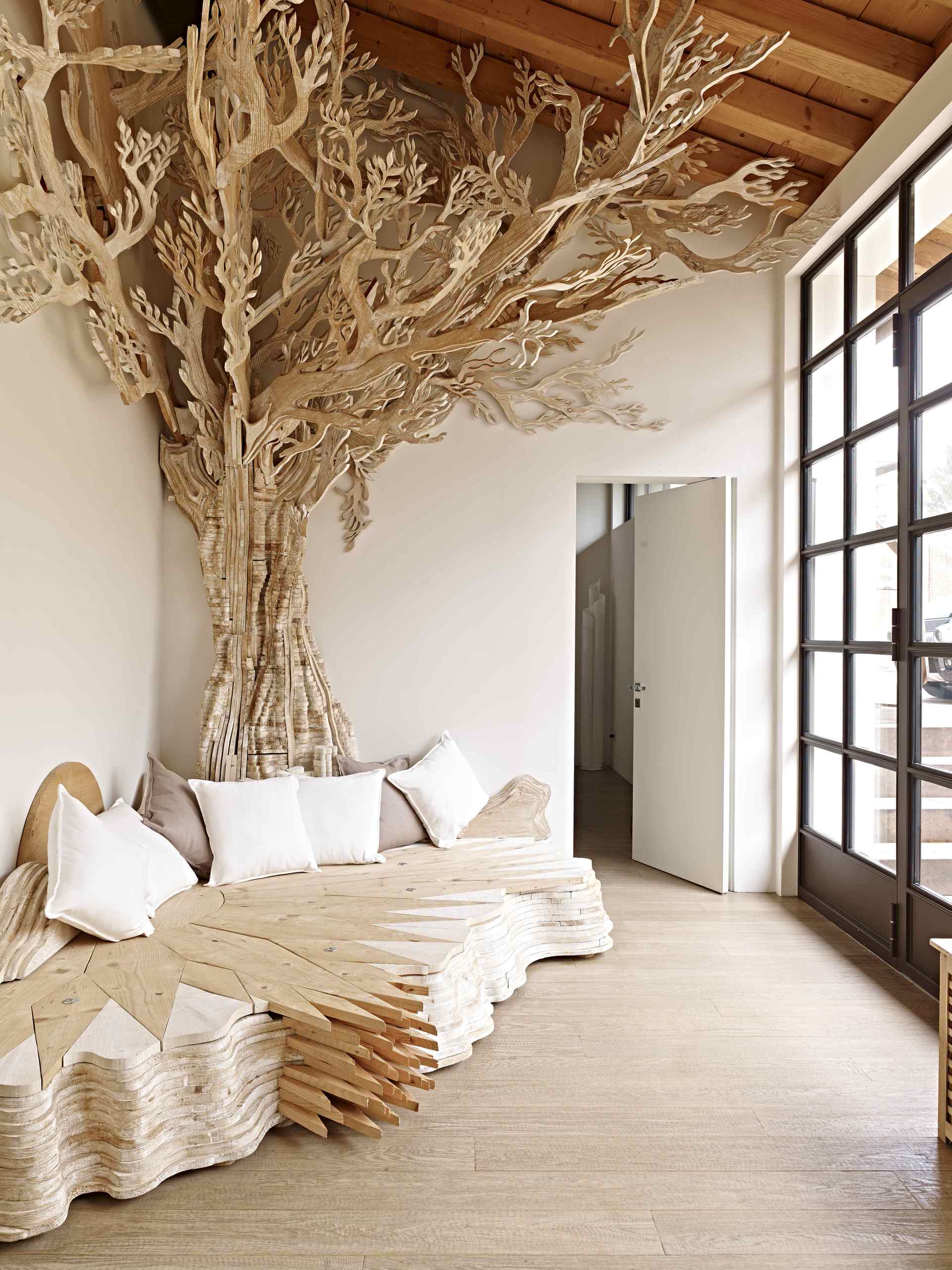 Introduire la nature dans la maison est l’un des principaux axes sur lesquels s’appuie le style organique. On le retrouve dans les courbes des minéraux, comme des pierres rondes et des rochers polis par la pluie, ou dans la présence d’arbres intérieurs, naturels ou stylisés comme ci-dessus. L’évocation de la nature renforce le sentiment d’authenticité de la demeure : il invite à une projection dans un espace naturel, libre et bénéfique.