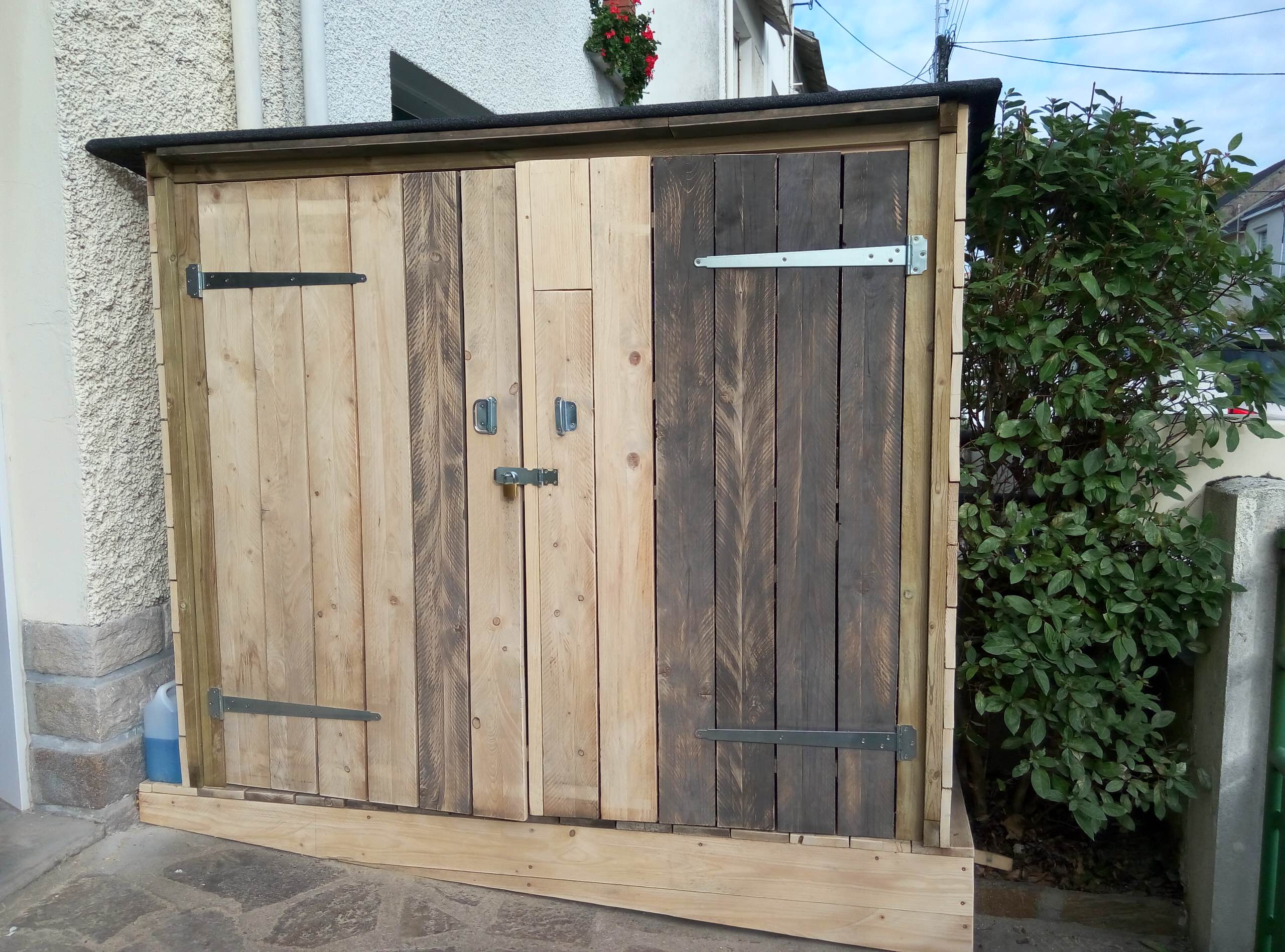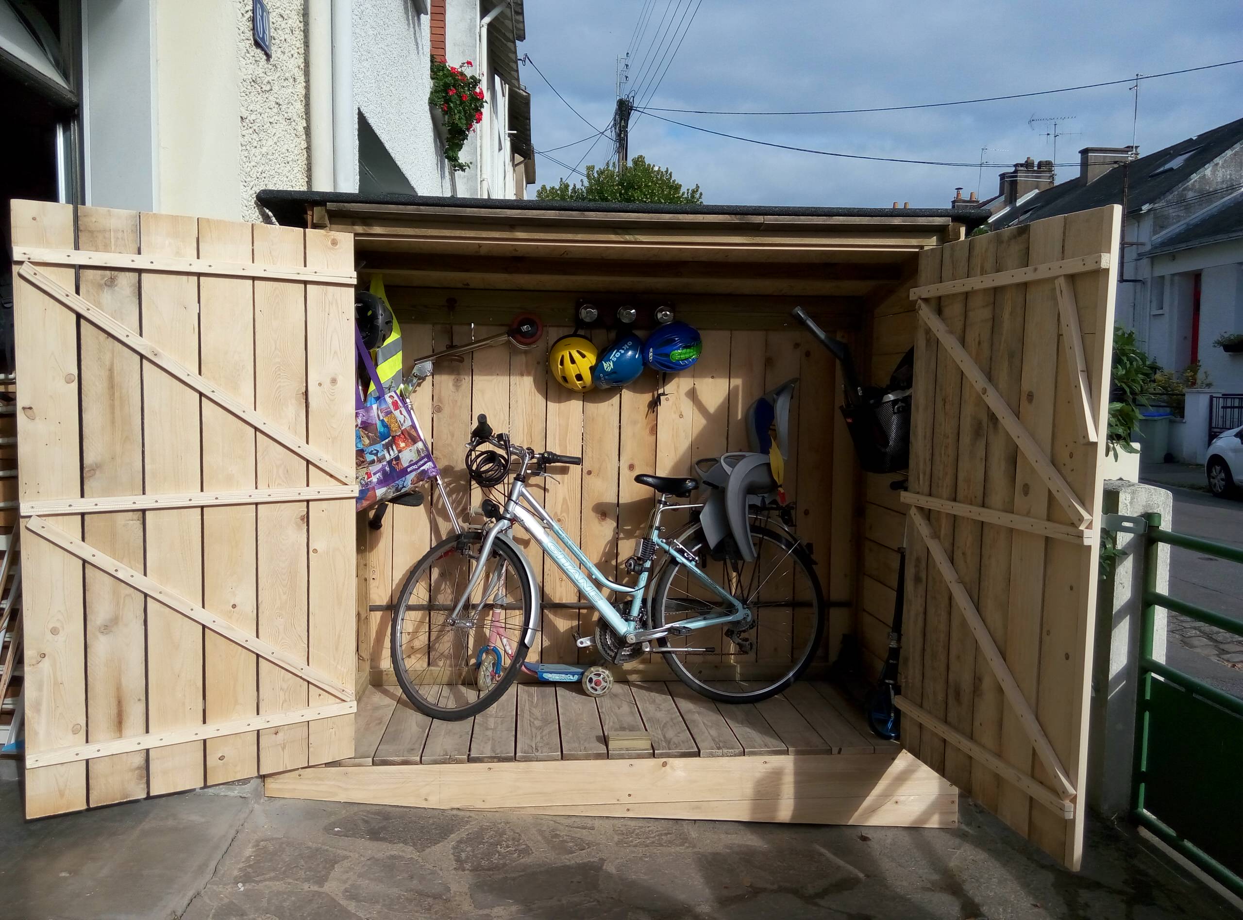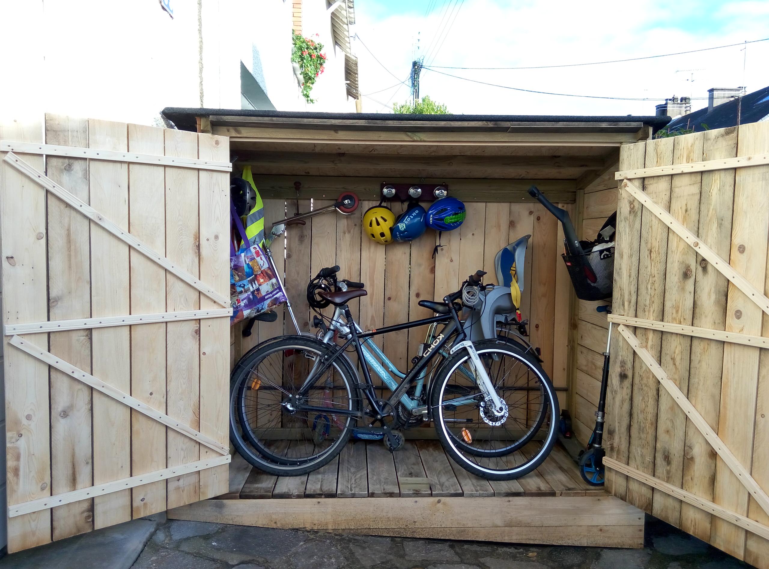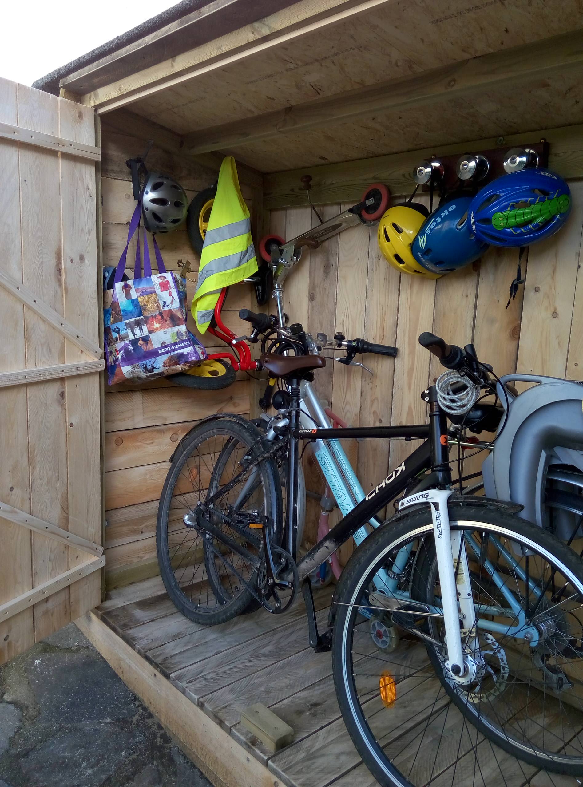 Il nous fallait un abri de jardin pour loger deux grands vélos d’adultes, deux trottinettes, un vélo d’enfant, des patins à roulettes… Cet abri peut également servir de bûcher ou de cabane à outils.