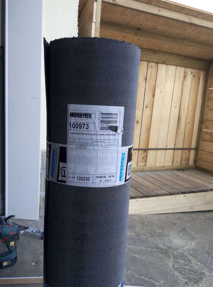 Pour finir la toiture, nous avons opté pour la solution de facilité avec le feutre bitumeux. Peu onéreux, il est également facile à mettre en œuvre car il se coupe au cutter. Nous l’avons choisi gris ardoise, mais il existe aussi en rouge ou en vert. Malheureusement, le conditionnement en rouleau de 10 x 1 m nous a obligés à des découpes pour notre toit de 225 x 105 cm, et à faire beaucoup de chutes…