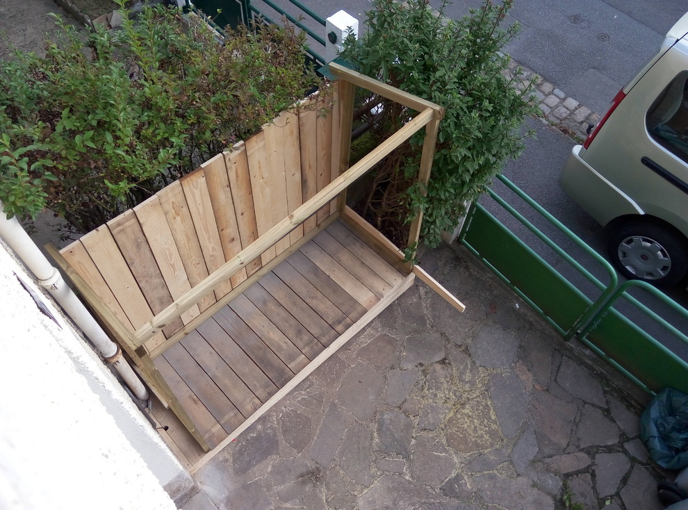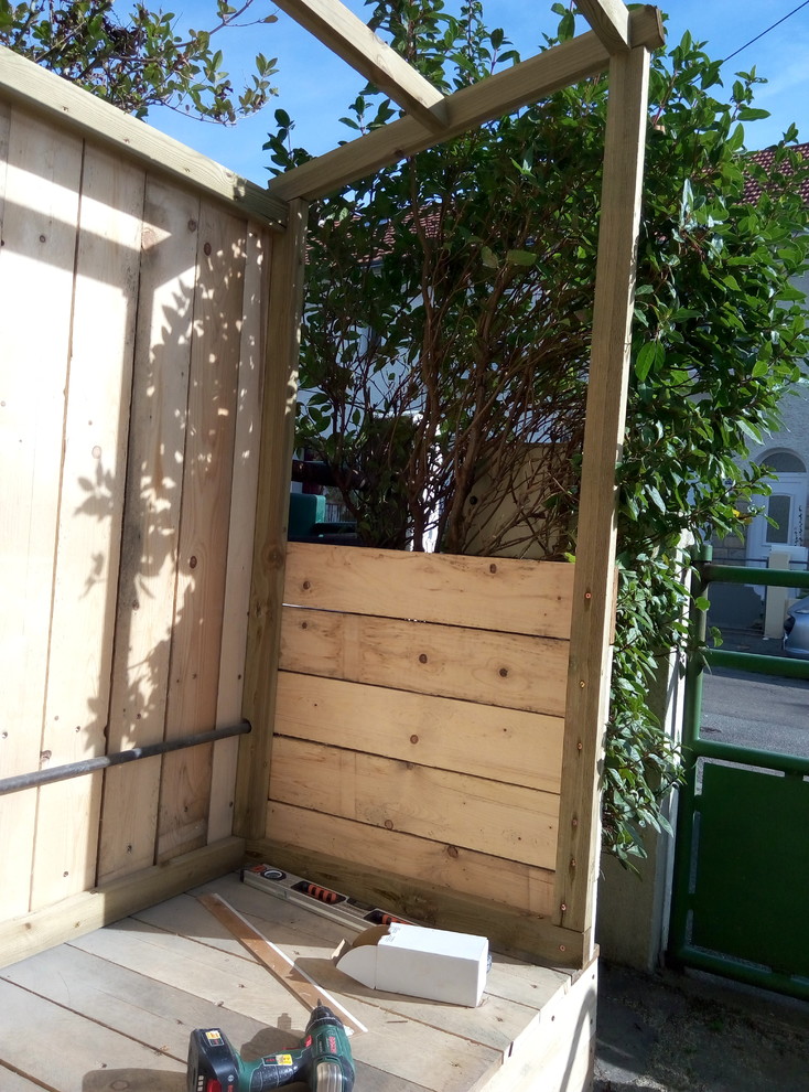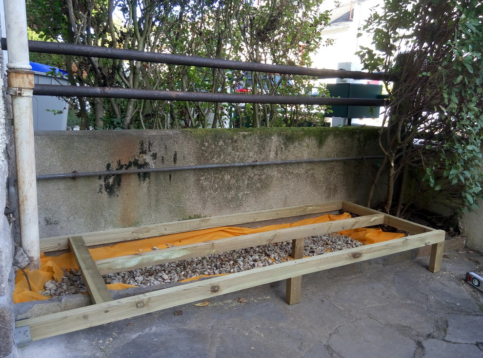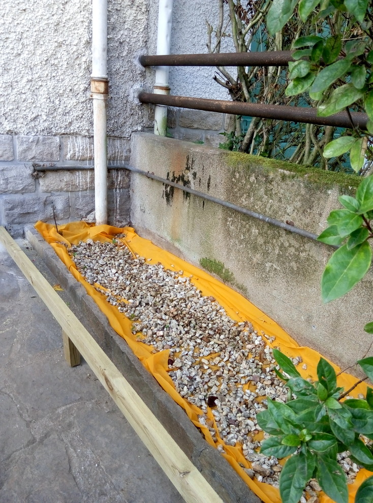 Nous avons décidé de construire l’abri devant la maison, en limite de propriété, à la place d’une plate-bande avec des arbustes. La zone posait quatre contraintes : il existait un muret maçonné d’une dizaine de centimètres pour retenir la plate-bande à l’avant, un tuyau de gaz courait sur le mur arrière et une descente pluviale sur le côté gauche. Enfin, l’emplacement était en pente : entre la gauche et la droite, il existe un dénivelé d’une trentaine de centimètres.