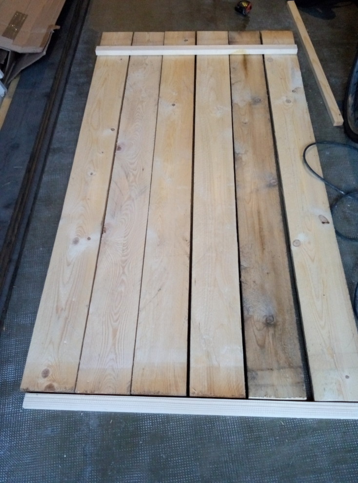 Nous avons compté 0,5 cm sur tous les côtés de chaque battant afin qu’ils s’adaptent au cadre sans coincer. Avec les écarts prévus entre chaque lame pour la dilatation, nous devions faire deux portes de 92 cm de large et 165 cm de haut. Nous avons donc assemblé six planches de coffrage pour la première.