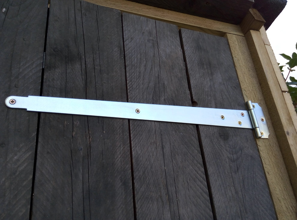 Nous avons fixé deux pentures anglaises par porte, à 30 cm du haut et du bas, en prenant garde qu’elles soient bien droites. Puis nous les avons fixées directement sur le cadre de la porte. Pour qu’elles ne frottent pas, nous avons glissé dessous notre règle en bois le temps de les fixer. Ainsi l’écart utile pour les manœuvrer a été bien respecté.
