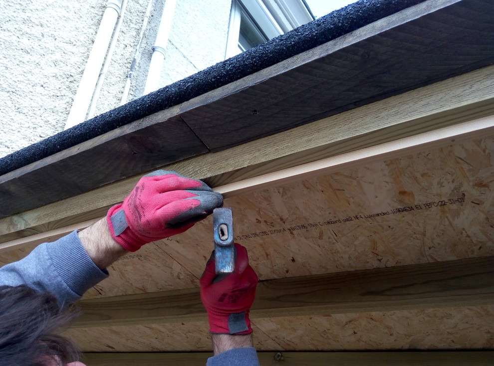 Nous avons agrafé le feutre bitumeux sous le débord du toit en tendant le matériau (ne pas trop tirer, sinon il se déchire). Nous avons découpé le surplus de feutre avec le cutter. À l’avant du toit, nous avons caché les agrafes en vissant des chutes de planches de coffrage. Sur la lambourde avant, nous avons fixé le carrelet en pin de 1 x 1 cm en l’alignant sur l’arrière de la lambourde. Il servira d’arrêt de porte.