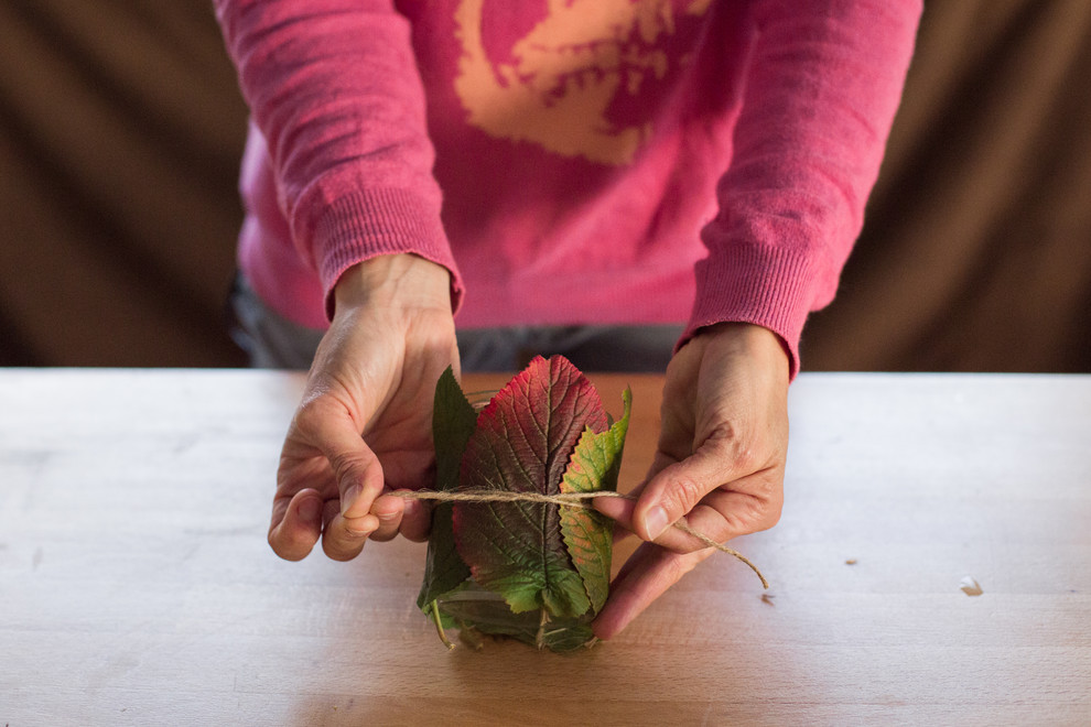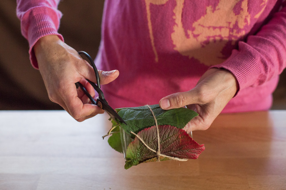 4. Nouez une ficelle rustique autour des feuilles. Cela permet de s’assurer que ces dernières sont bien collées et la ficelle ajoute aussi une note décorative au vase.