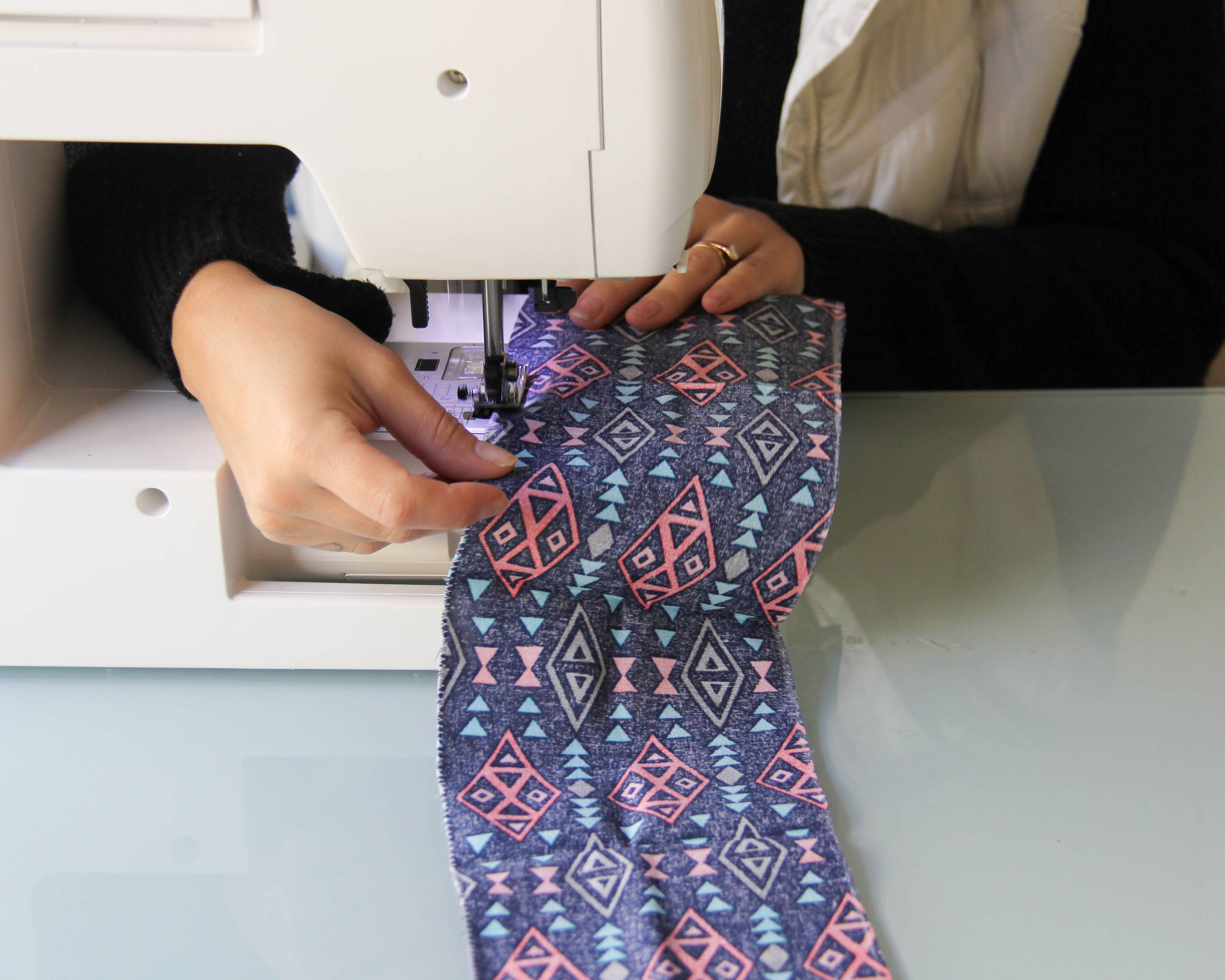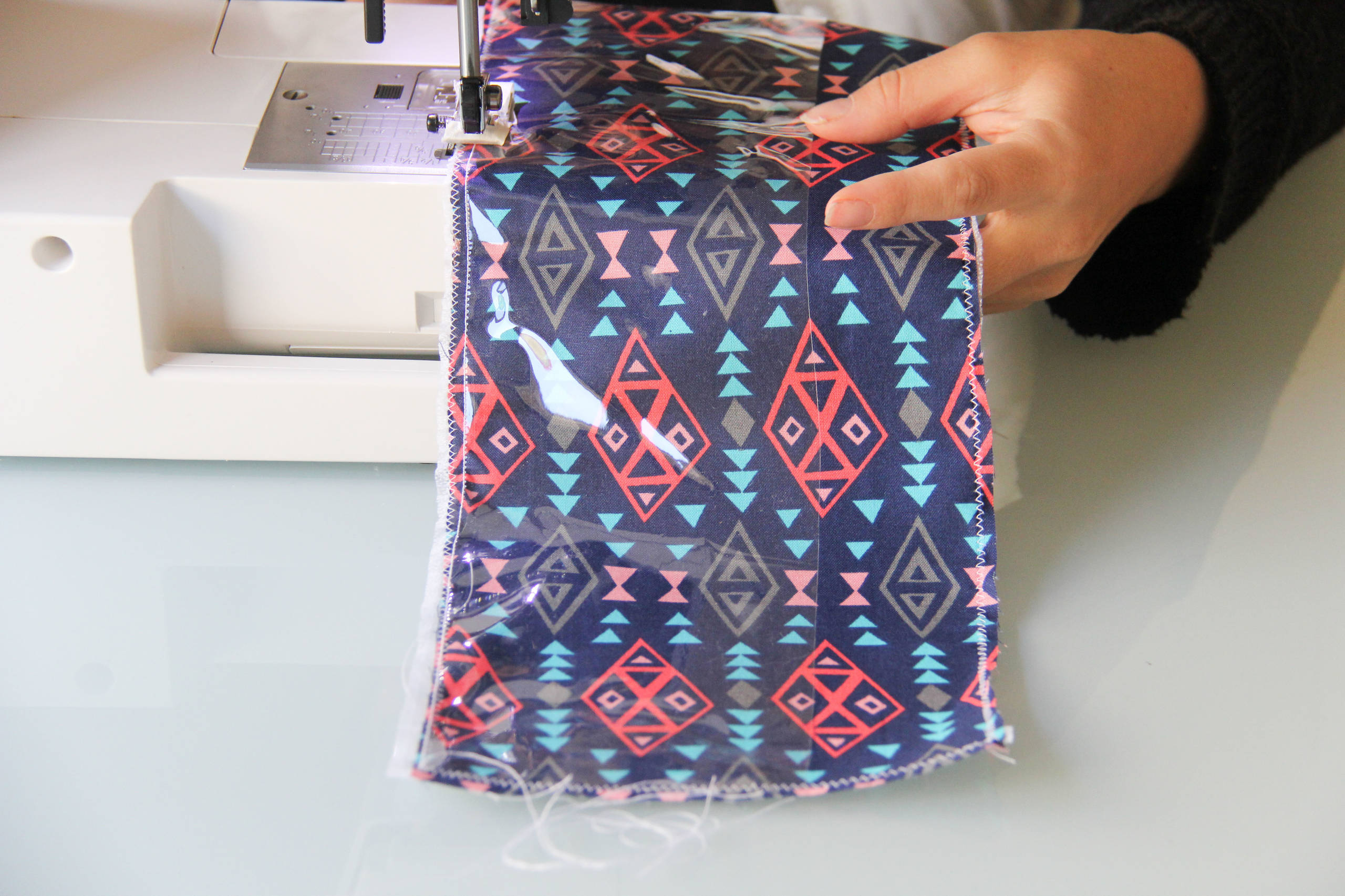 Placez les deux côtés ensemble, côté endroit à l’intérieur. Faites une couture à 6 mm du bord le long des côtés et du bas.