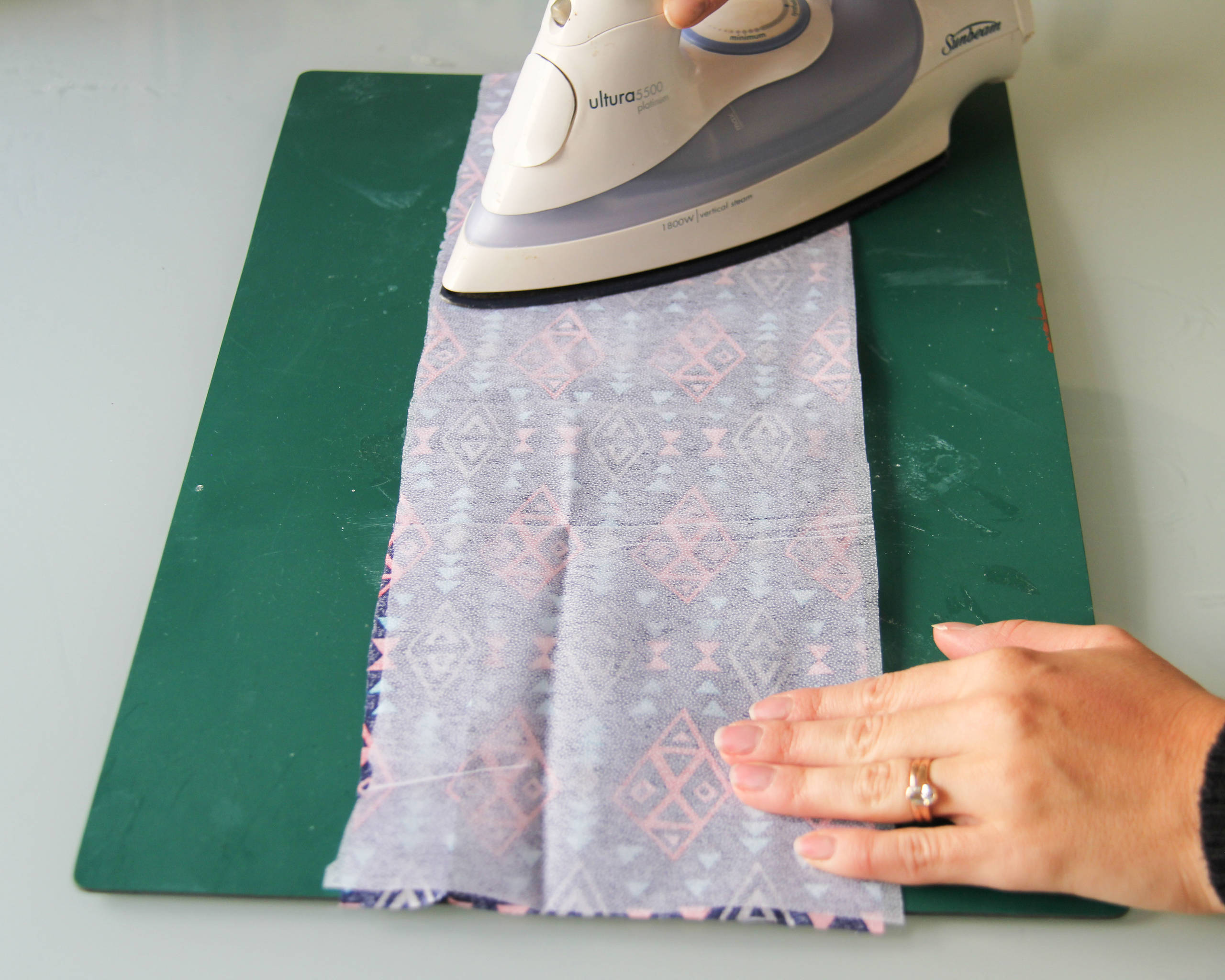 Prenez la partie du fond et placez le côté rugueux de l’entoilage contre l’envers du tissu. Repassez avec un fer chaud en veillant à ce que l’entoilage ne bouge pas. Une fois refroidi, vérifiez qu’il ait bien adhéré au tissu.