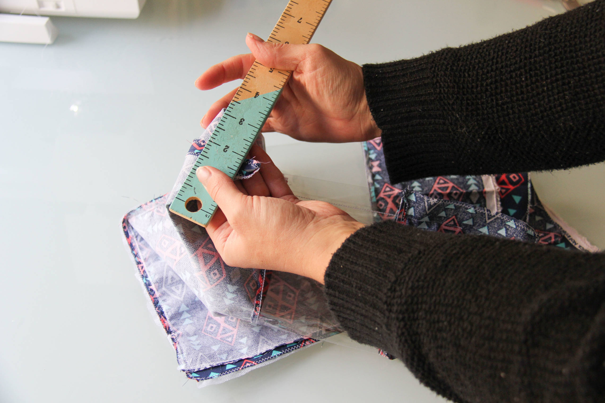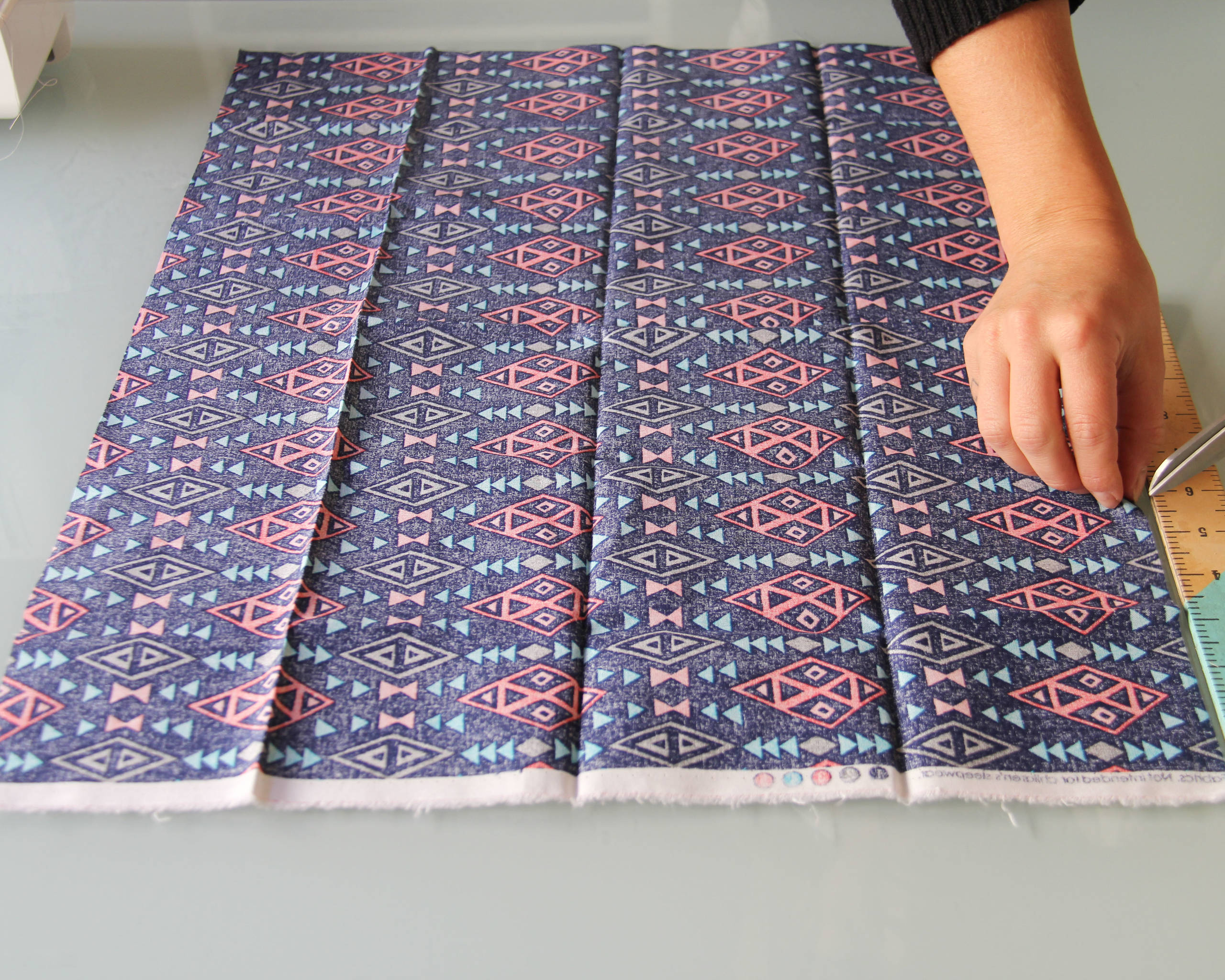 - Découpez deux morceaux de 15 cm x 45 cm de tissu et d’entoilage : ceux-ci formeront la partie du fond.